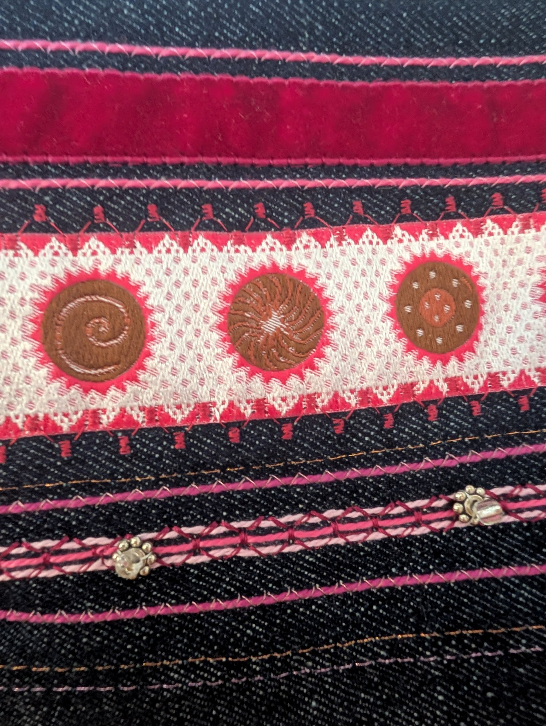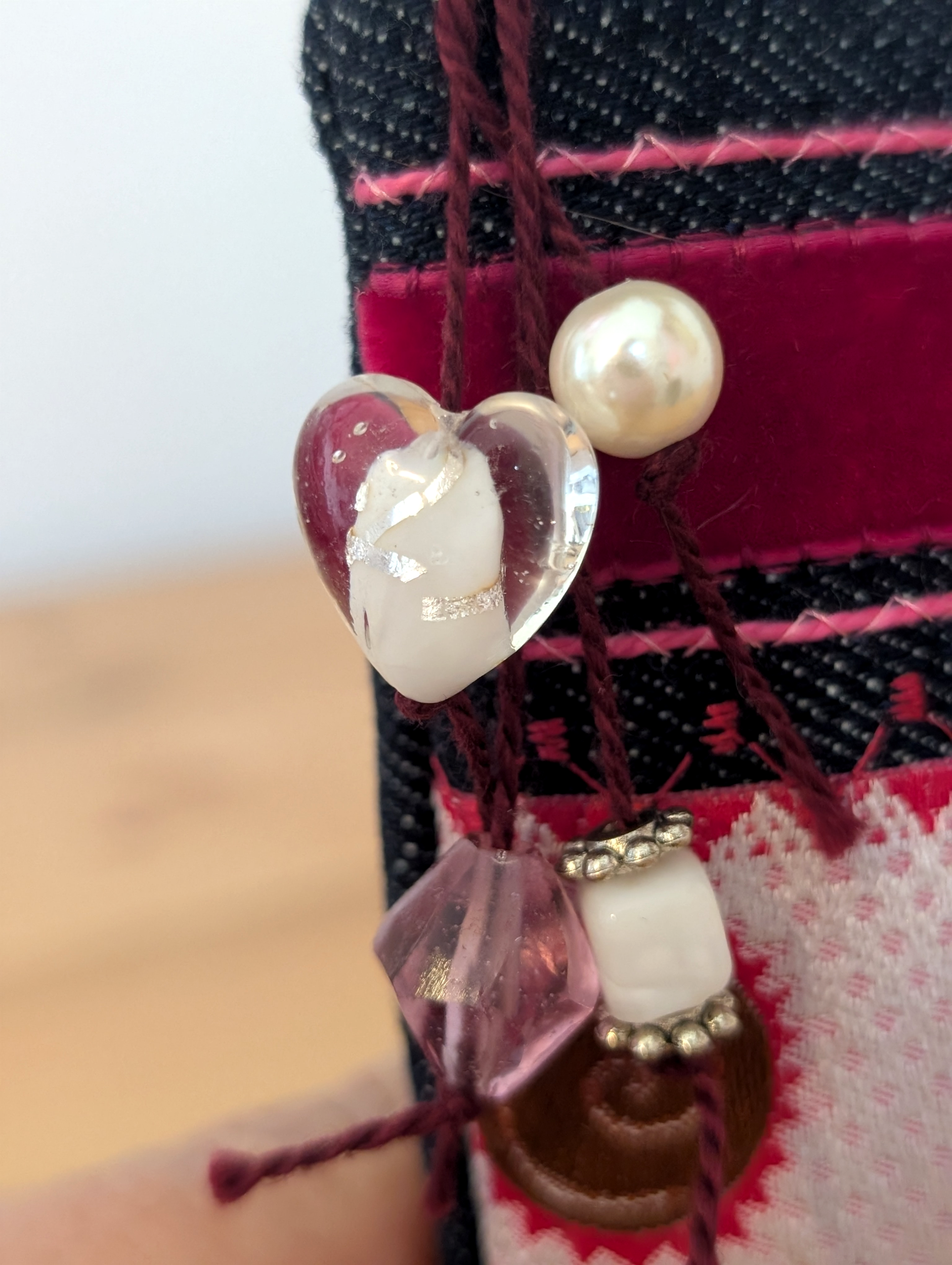 Finally, the elevated denim clutch of your dreams! It's jazzed up with beautiful burgundy velvet and jacquard trims, glass beads with decorative threads and stitches. This little bag is just right for carrying your phone, a small wallet, and a few makeup essentials.
