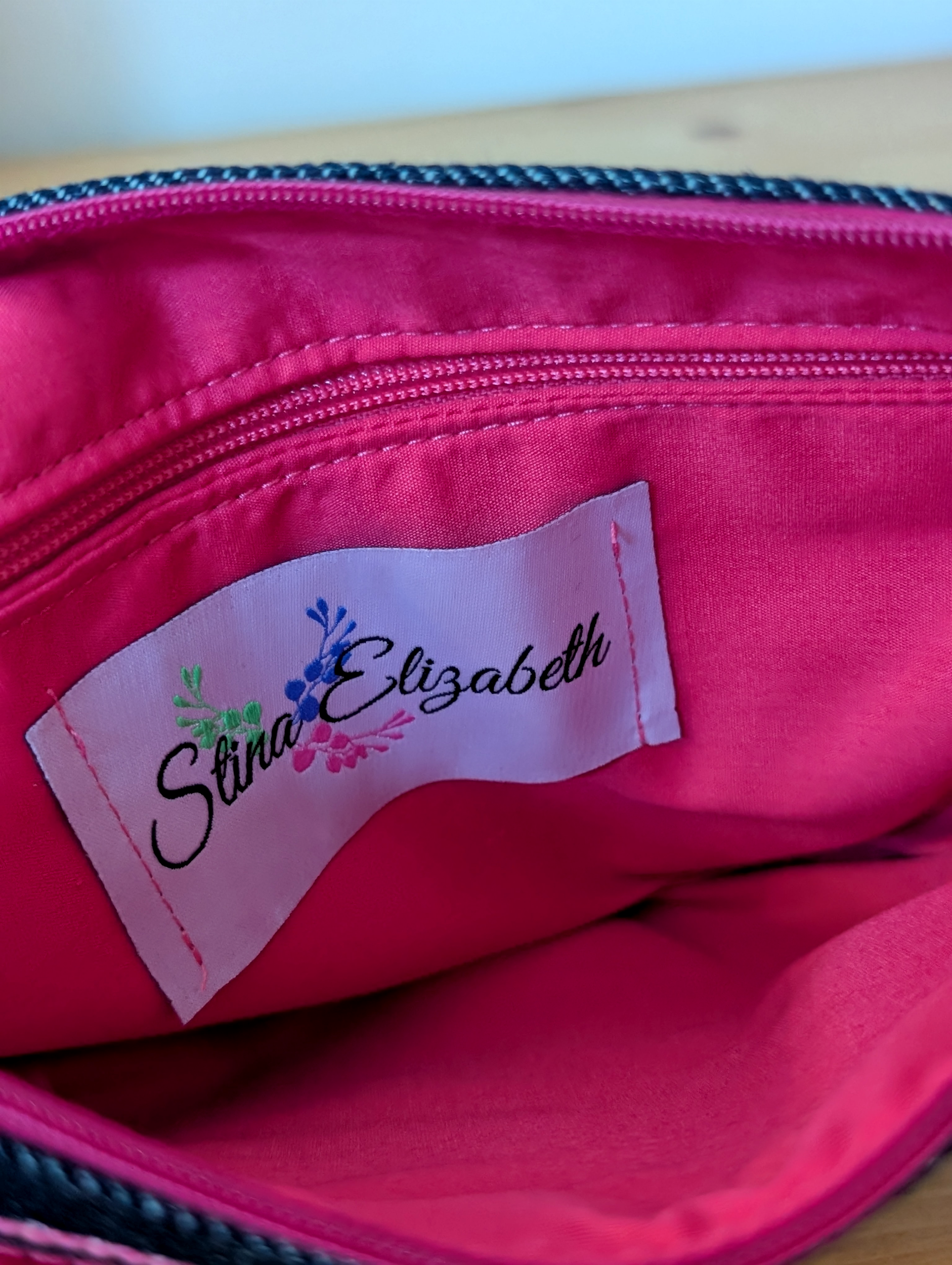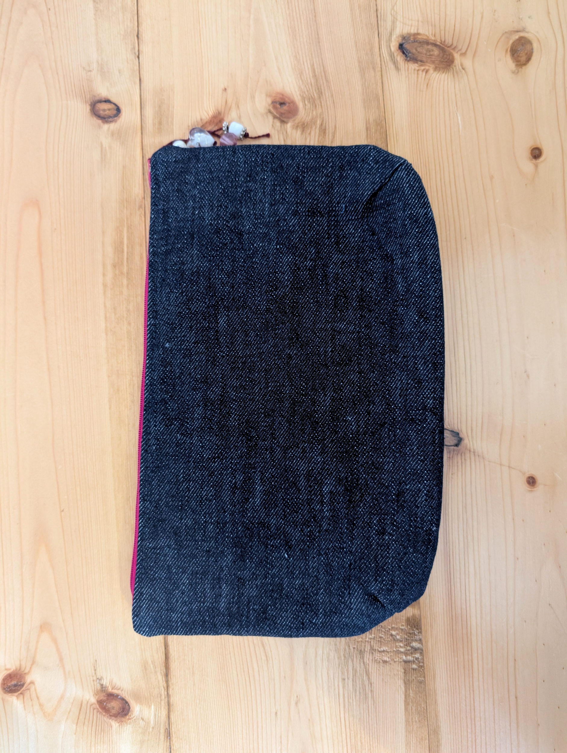 Exterior fabric is dark blue denim and the lining is cotton fabric in pink.