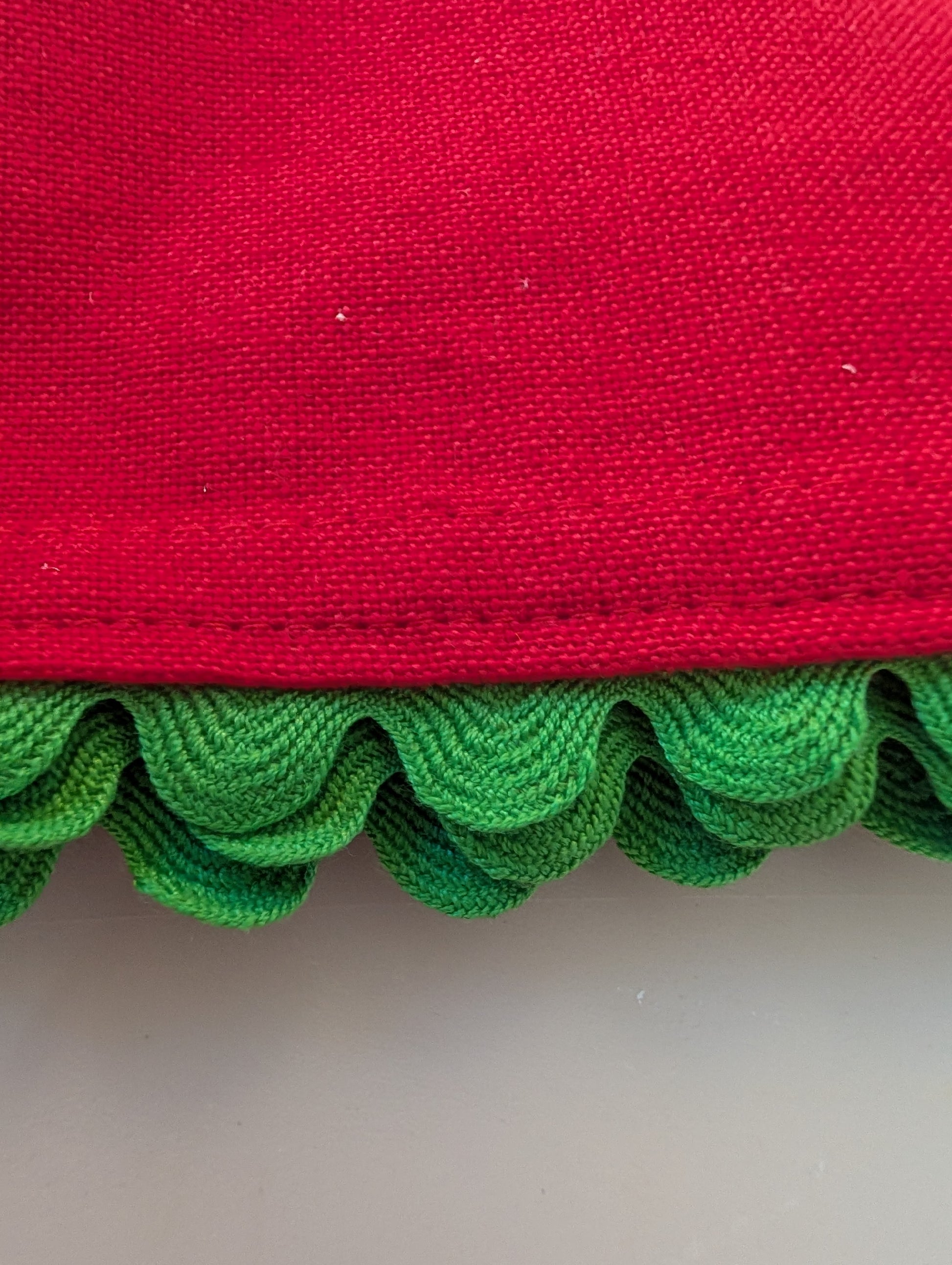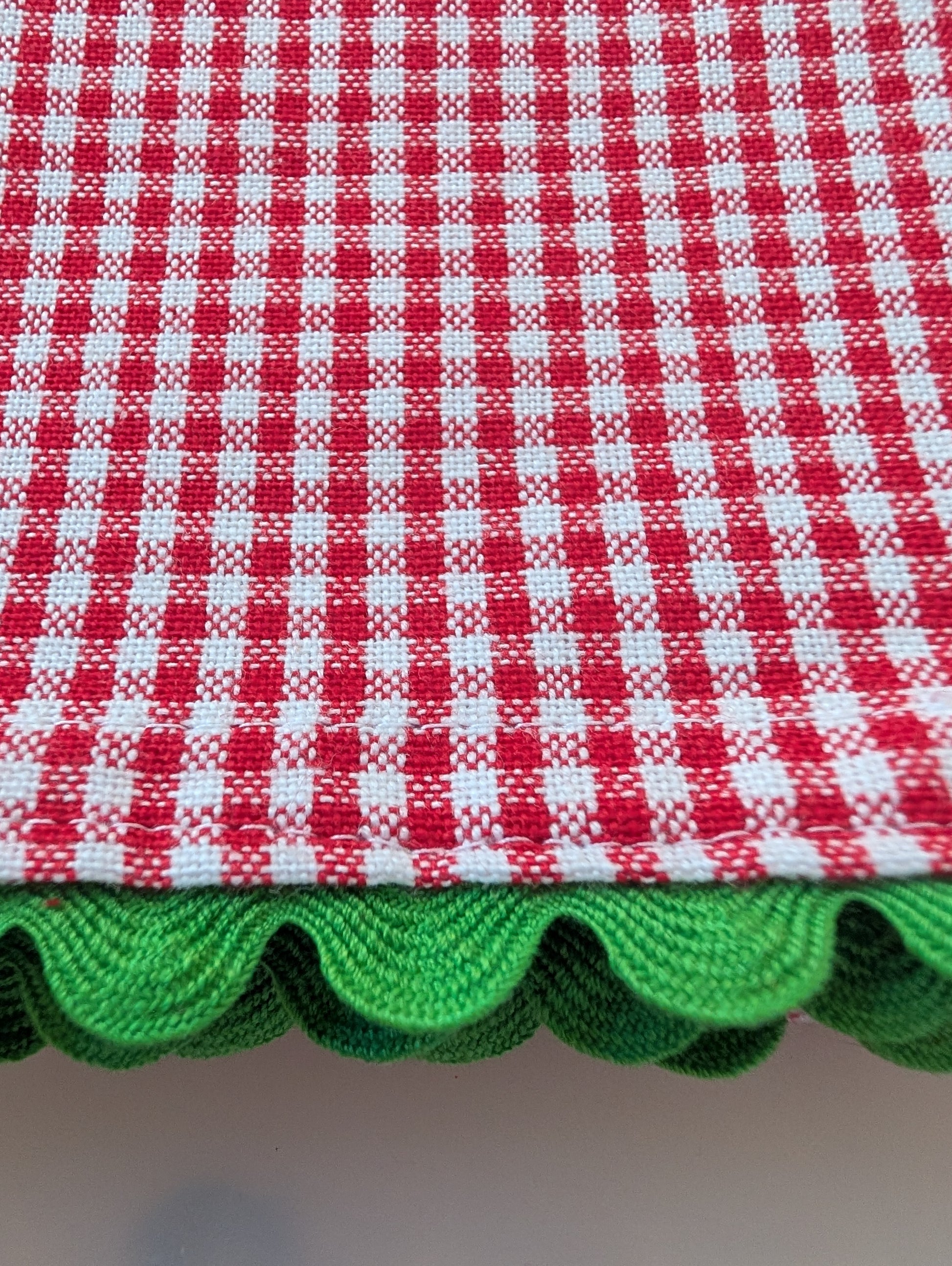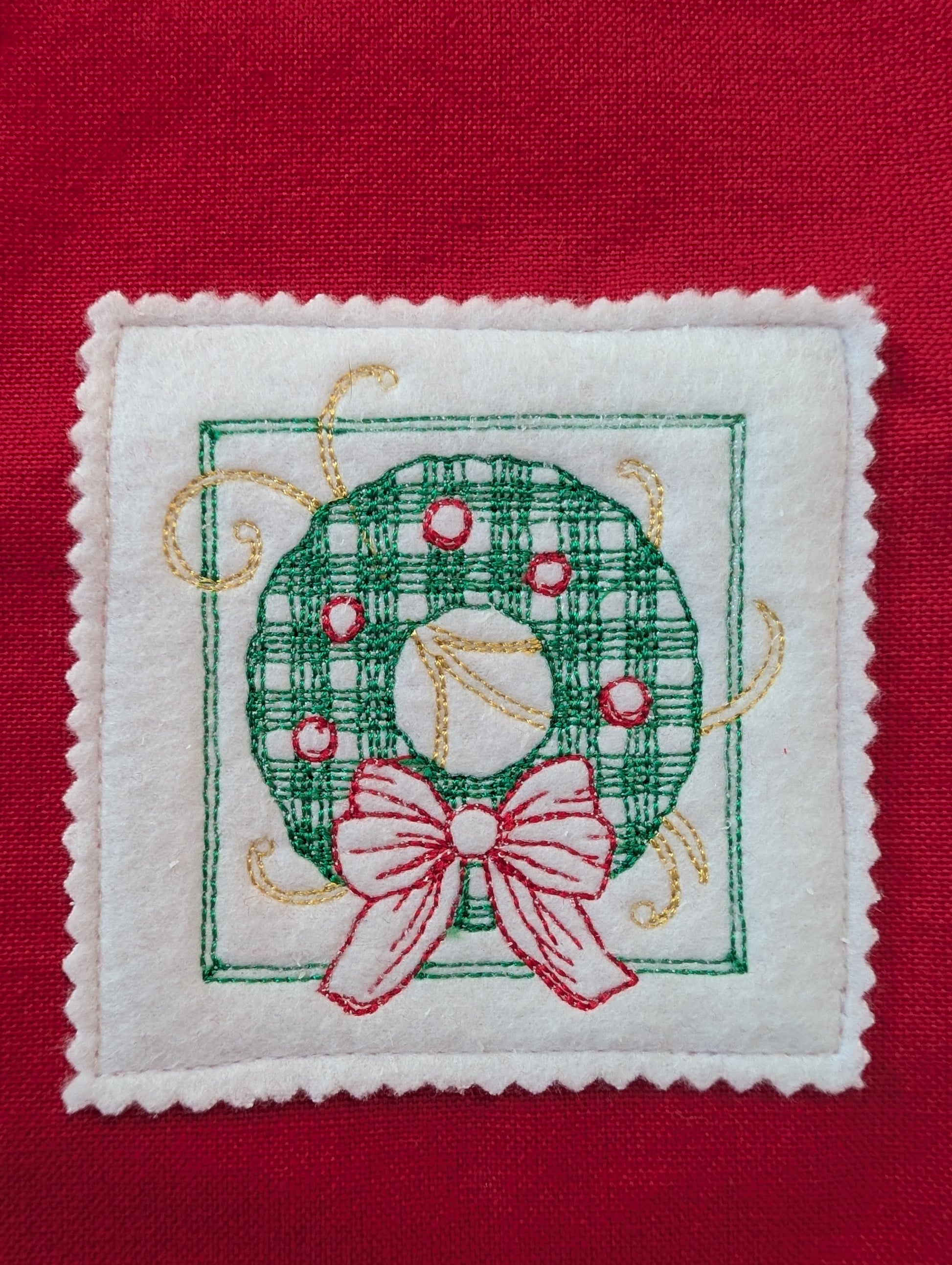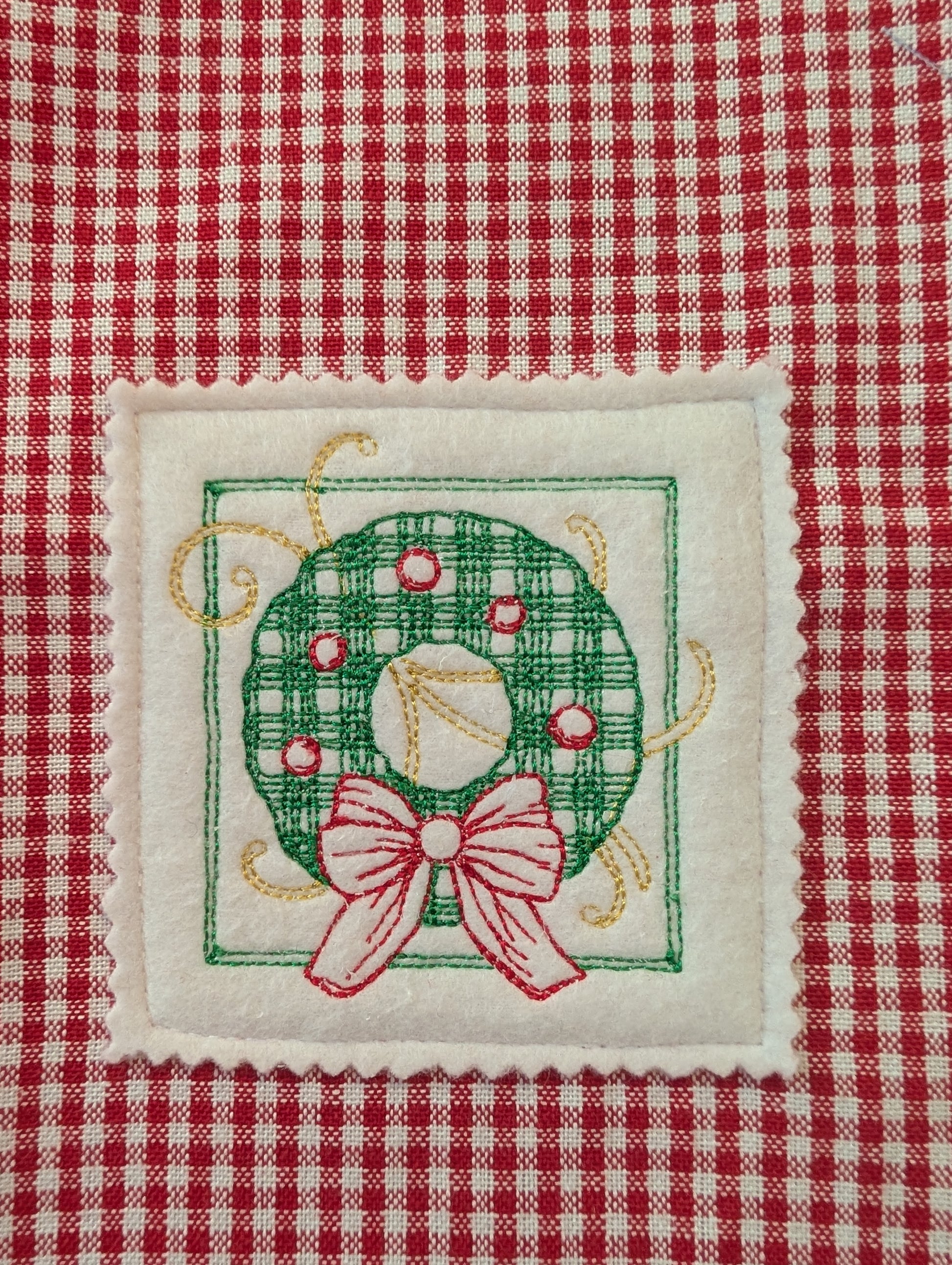 Set of two tea/kitchen towels machine embroidered beautiful Christmas wreaths design. Cotton green rick rack trim at the bottom.