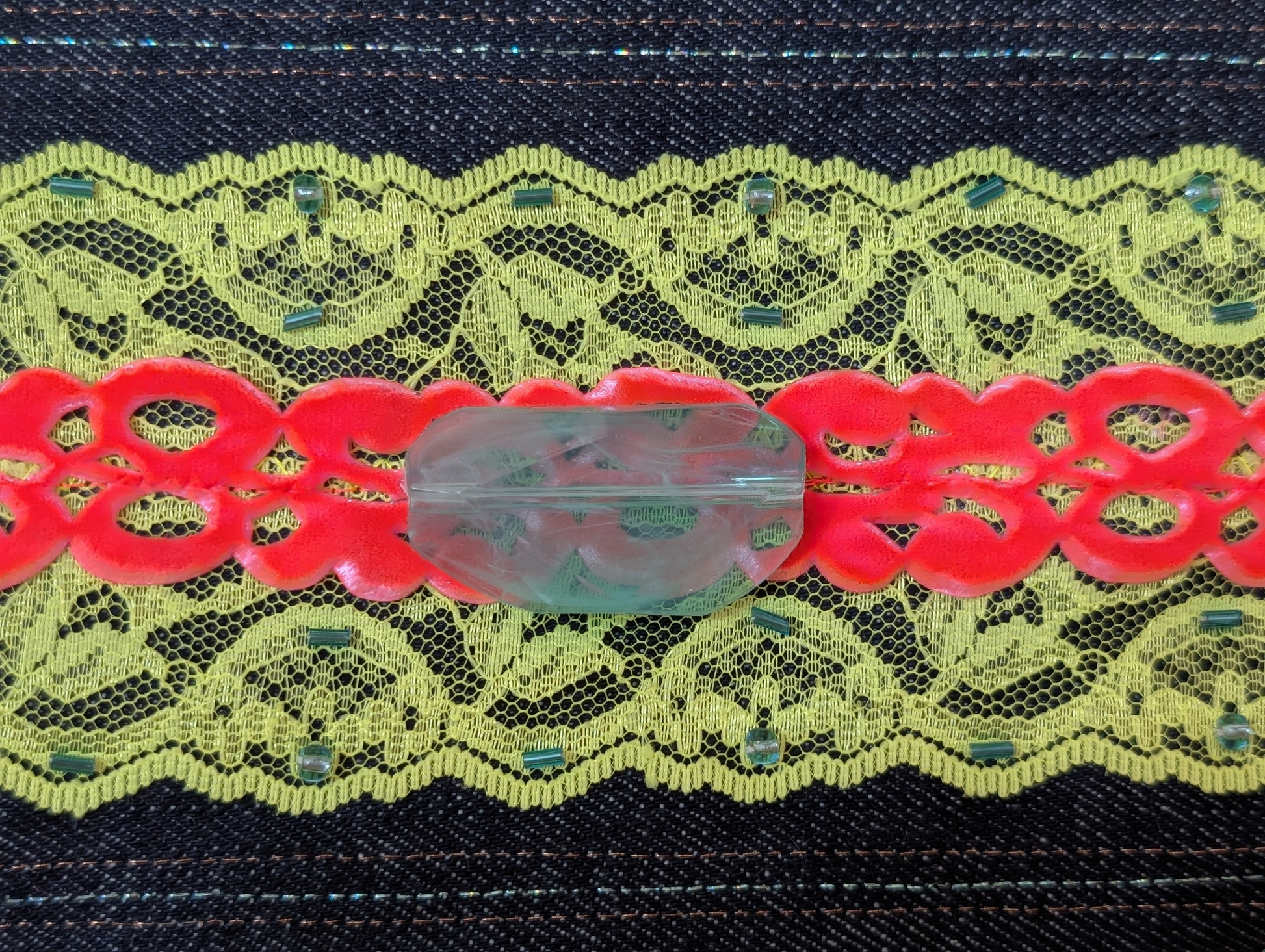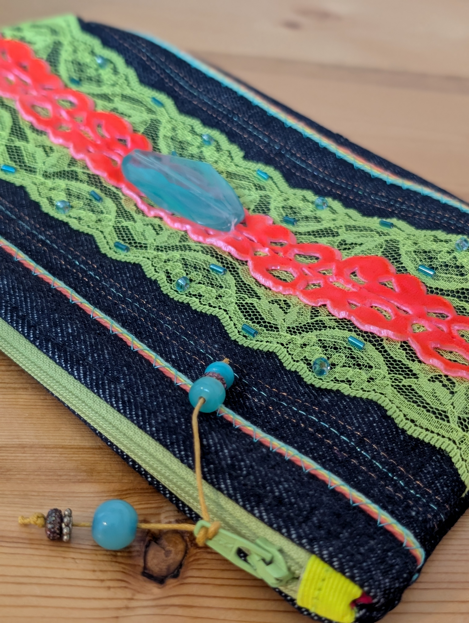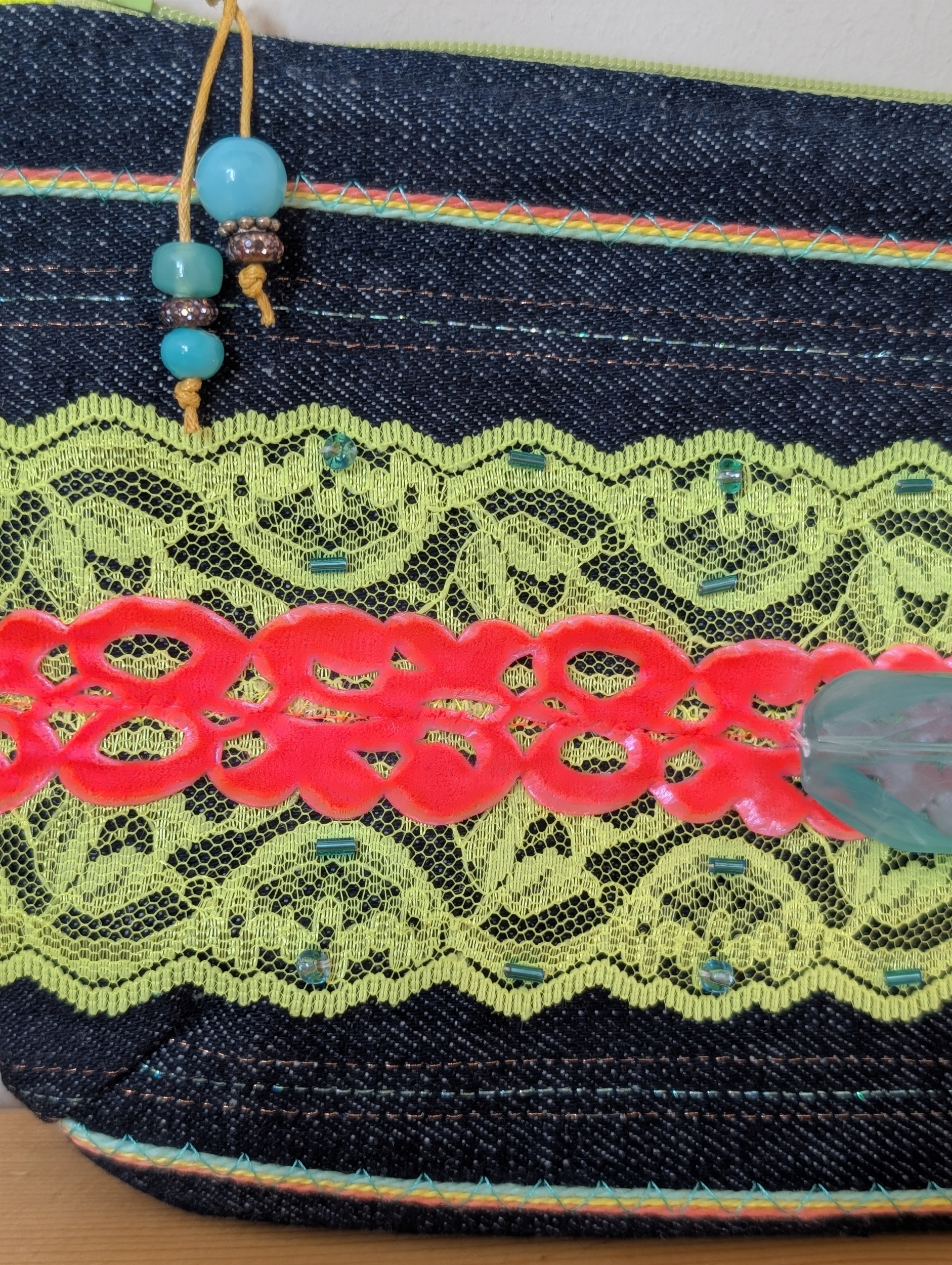 Looking for a pop of color? Well you’ve got it with this denim handbag clutch. A few of the unique elements of this handbag are the orange velvet trim over the green lace trim, the glass beads and the thread floss couching with decorative stitches. This little bag is just right for carrying your phone, a small wallet, and a few makeup essentials.