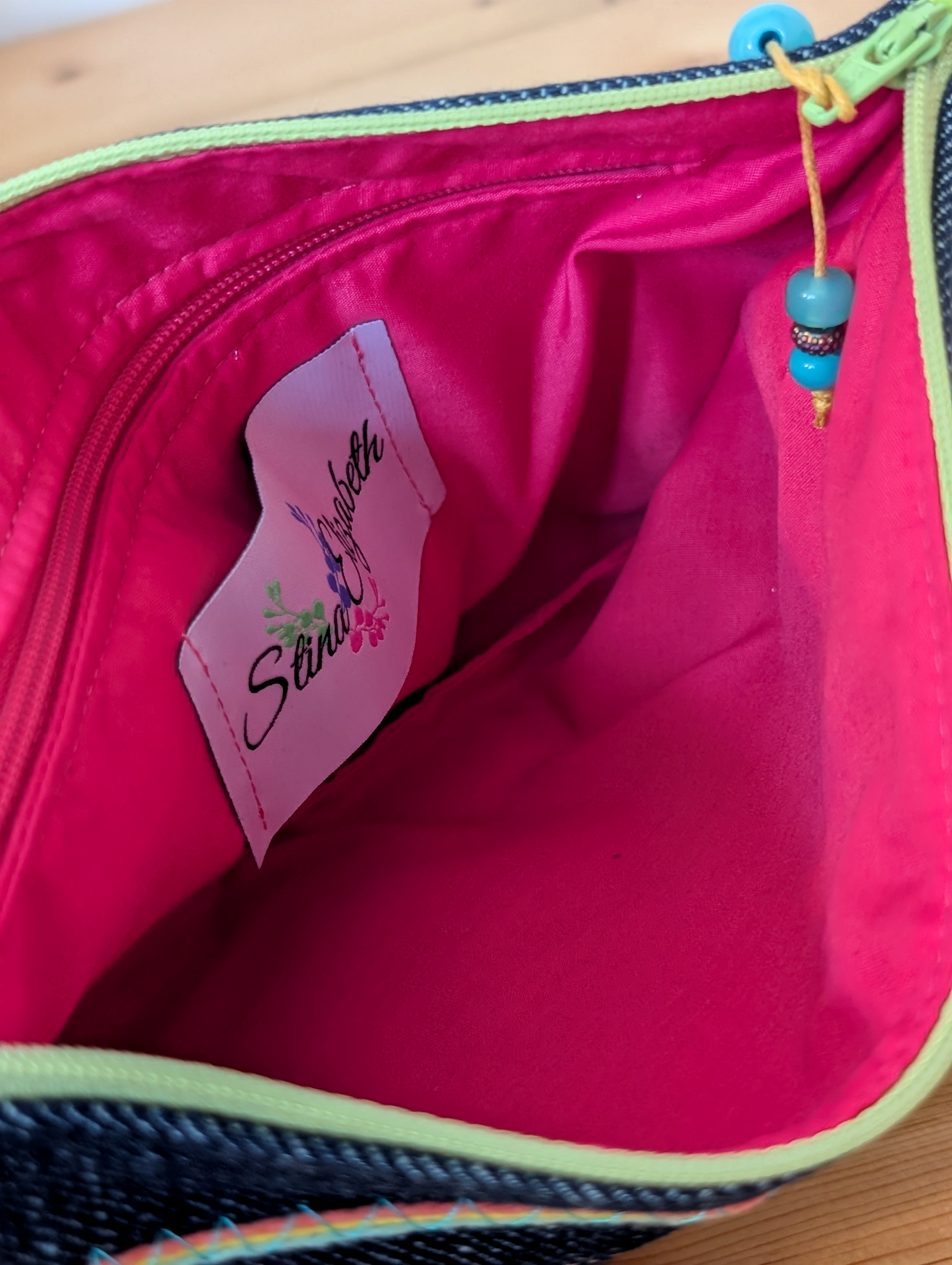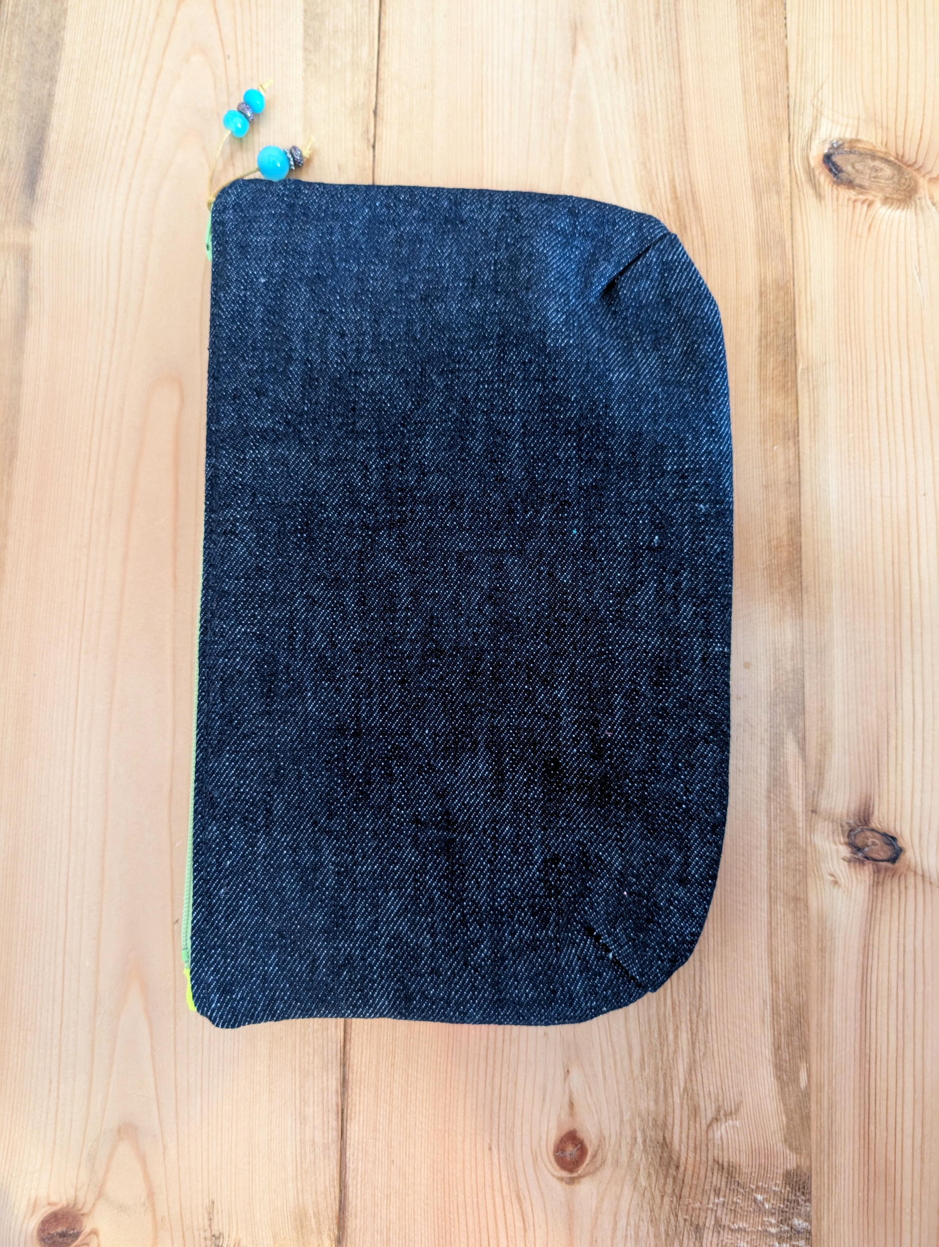Exterior fabric is dark blue denim and the lining is cotton fabric in pink.