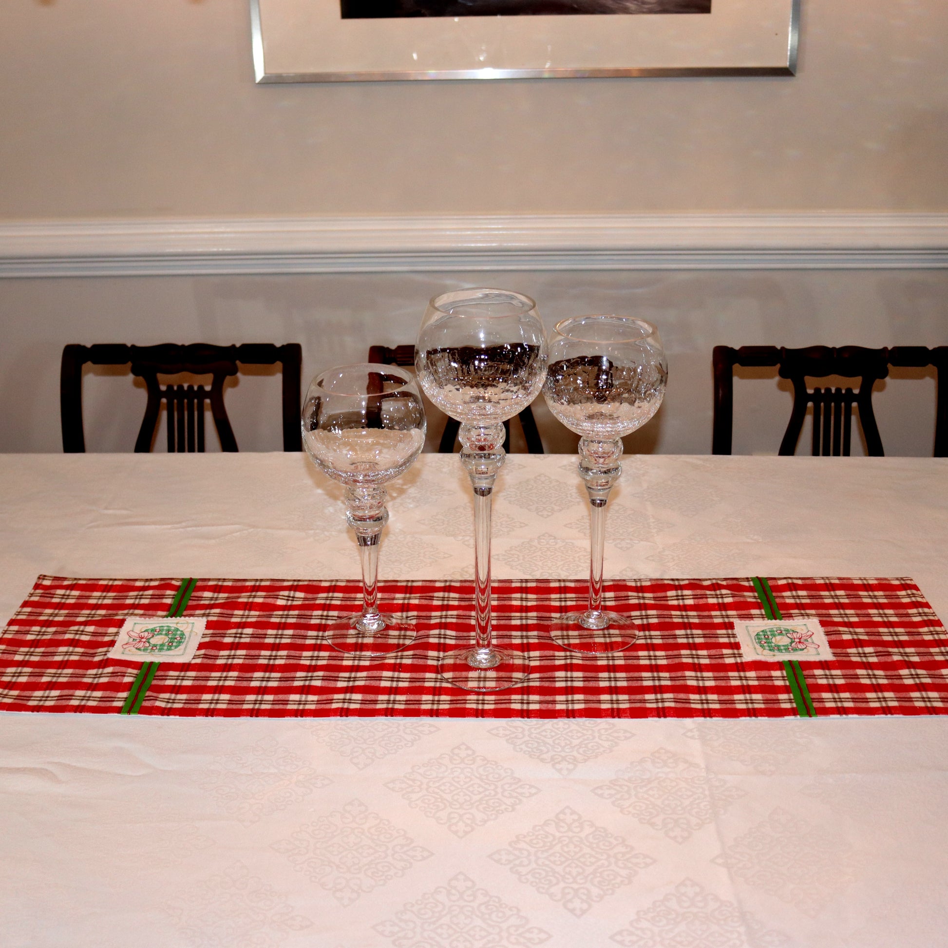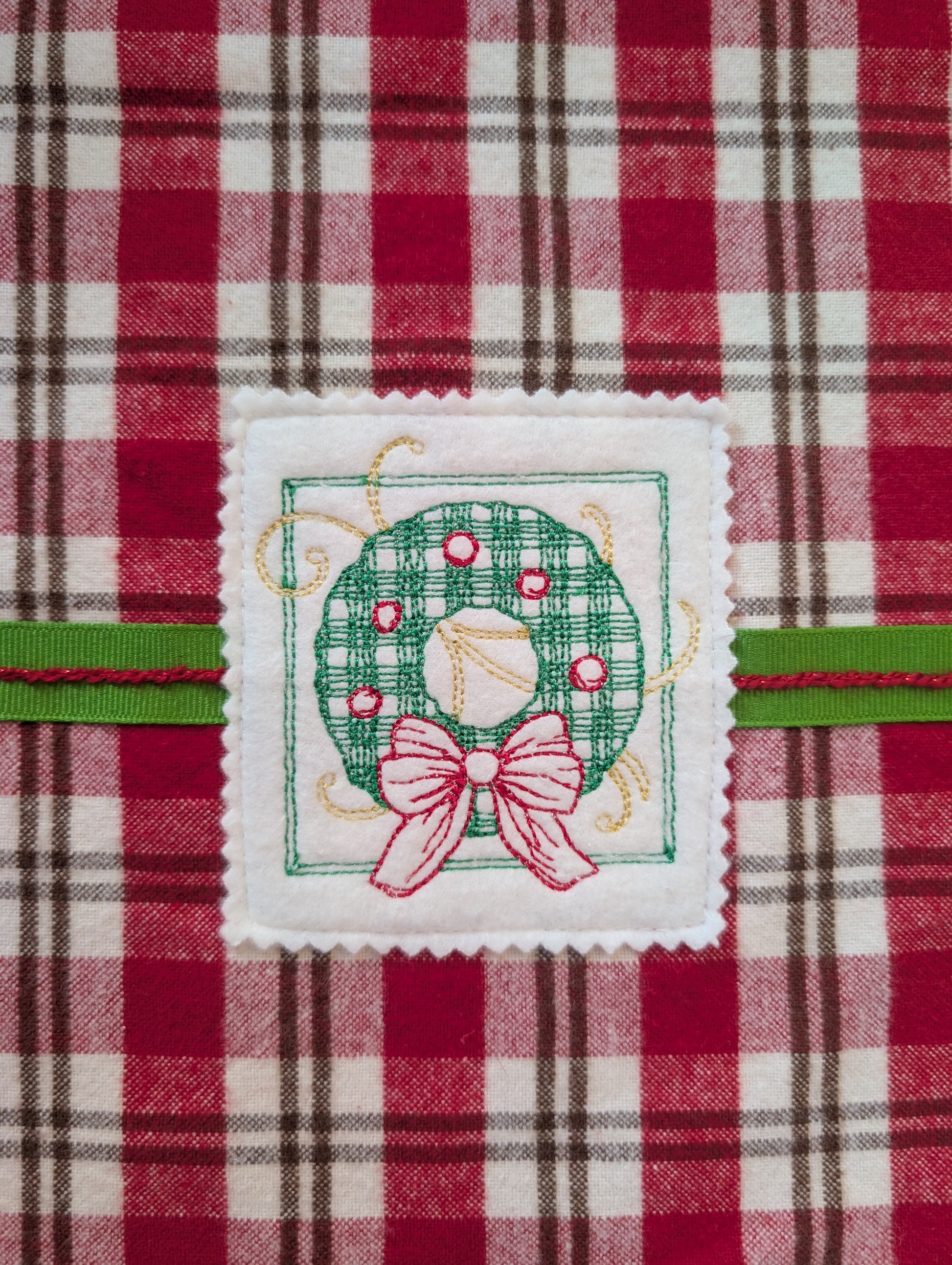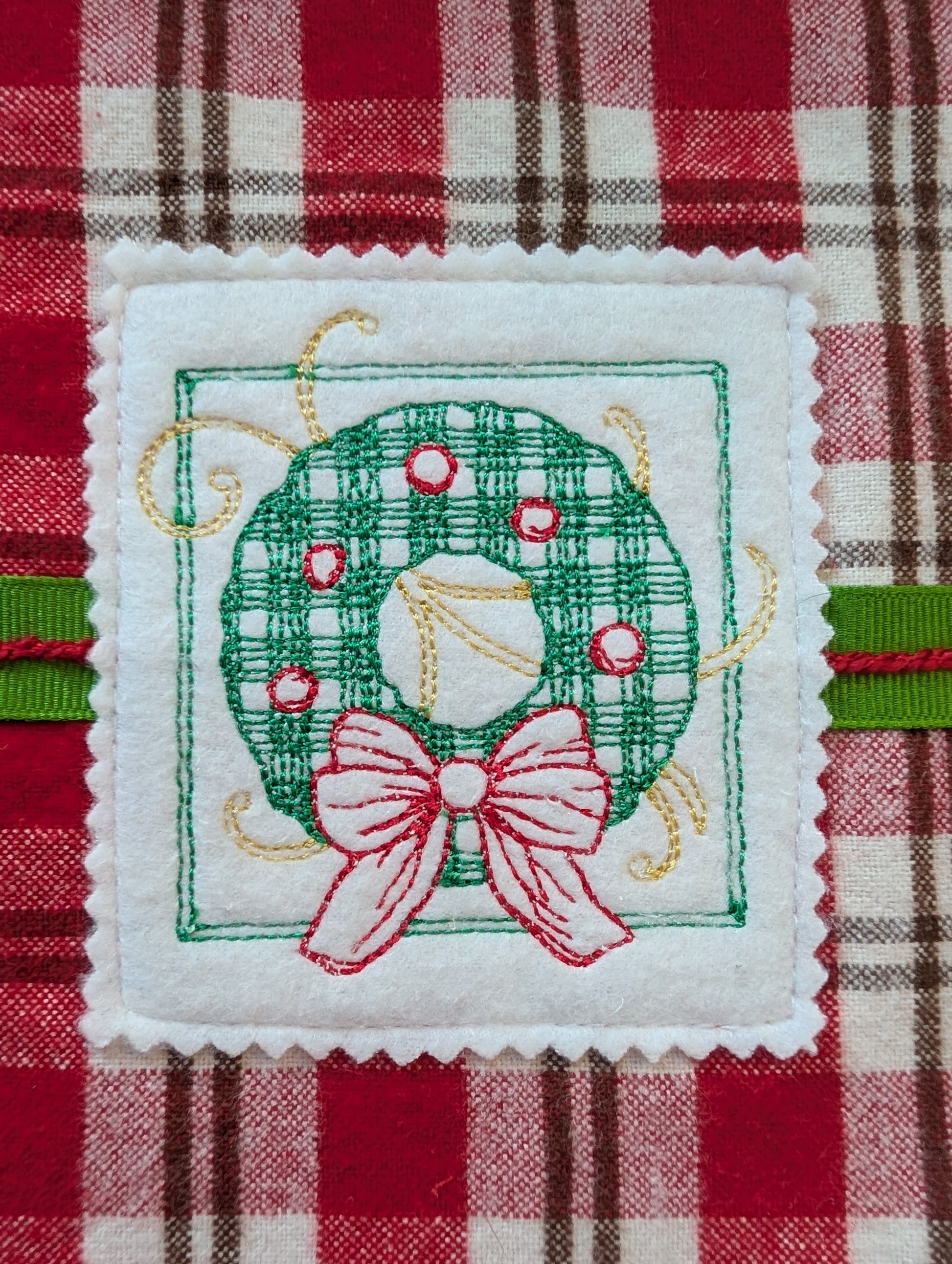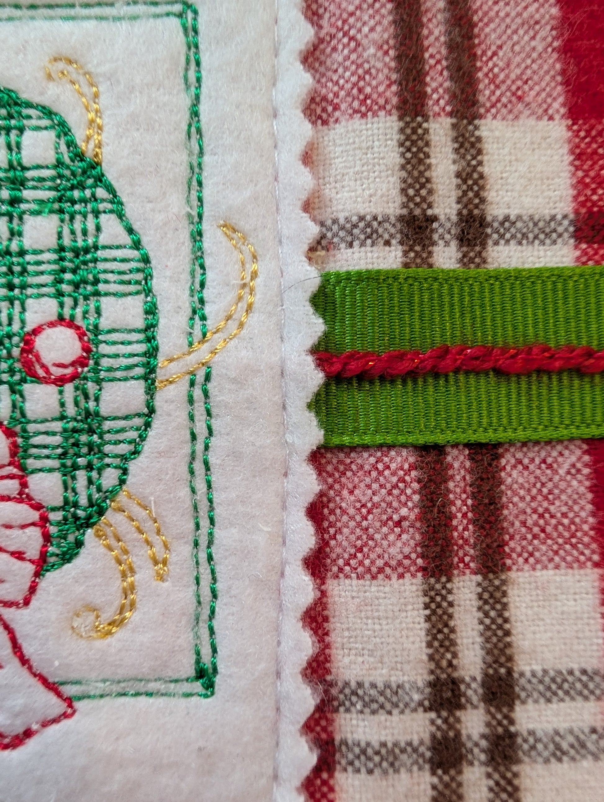 Machine embroidery of a beautiful Christmas wreath design with trims made of ribbon and decorative yarn on both ends.