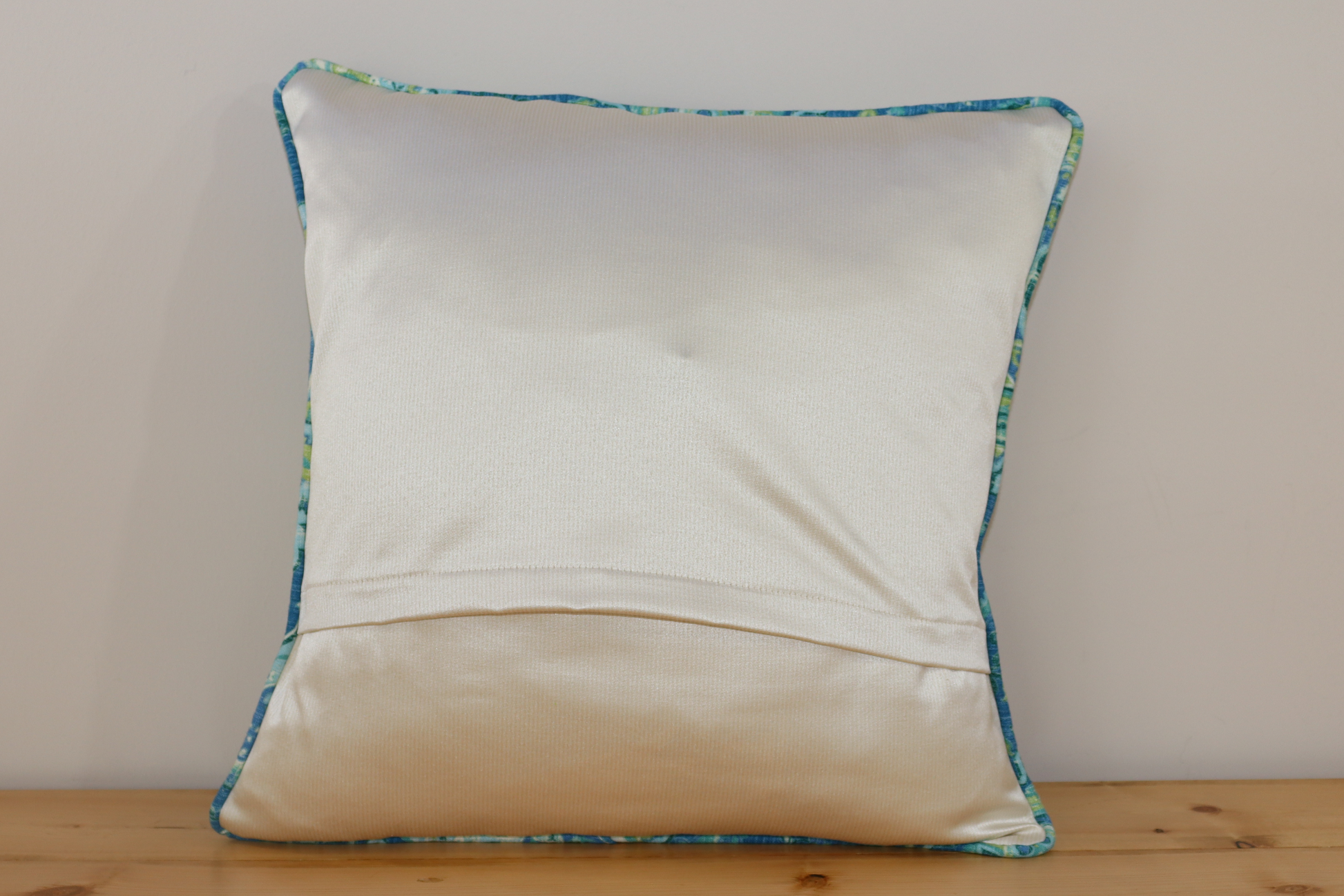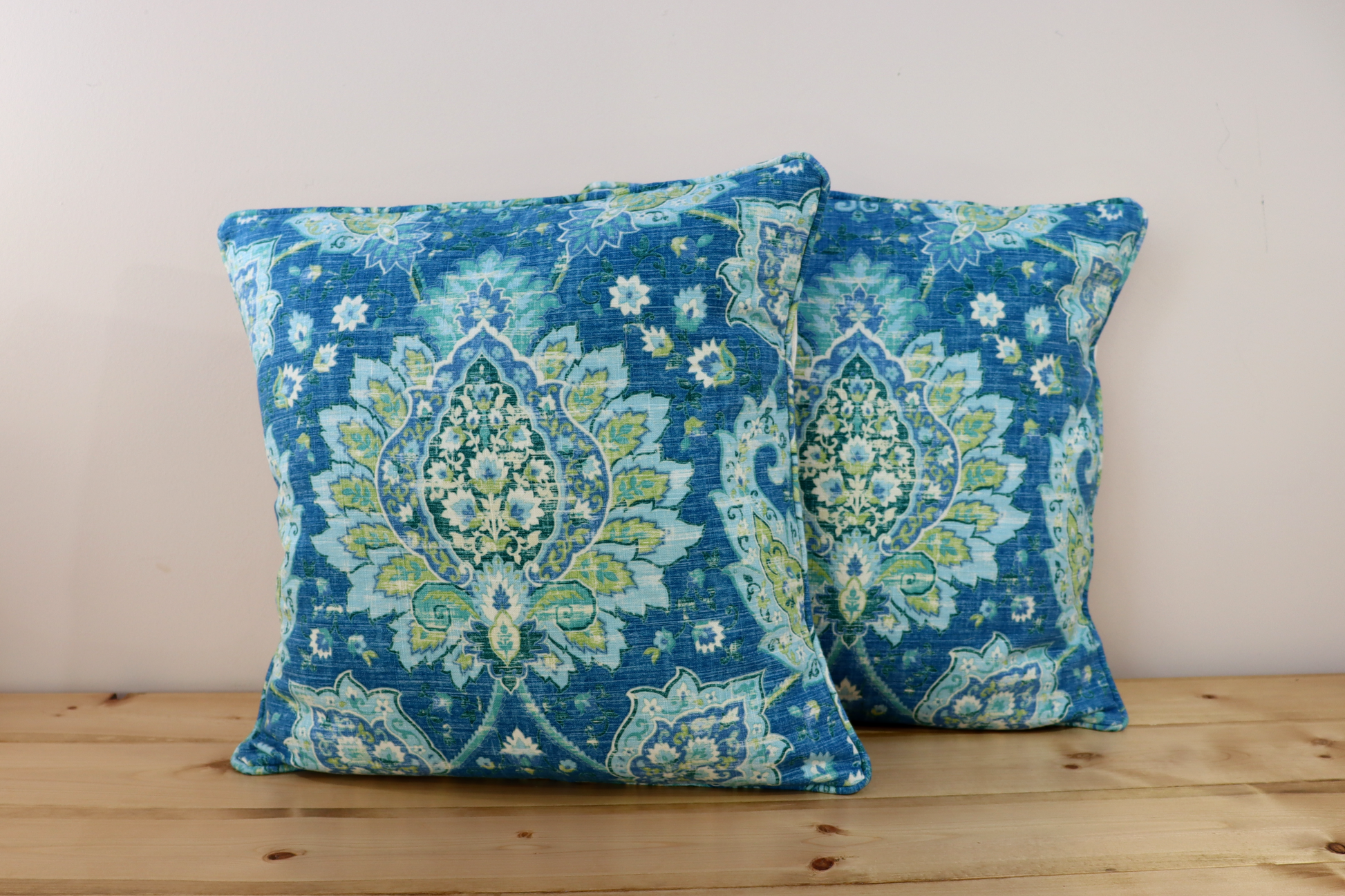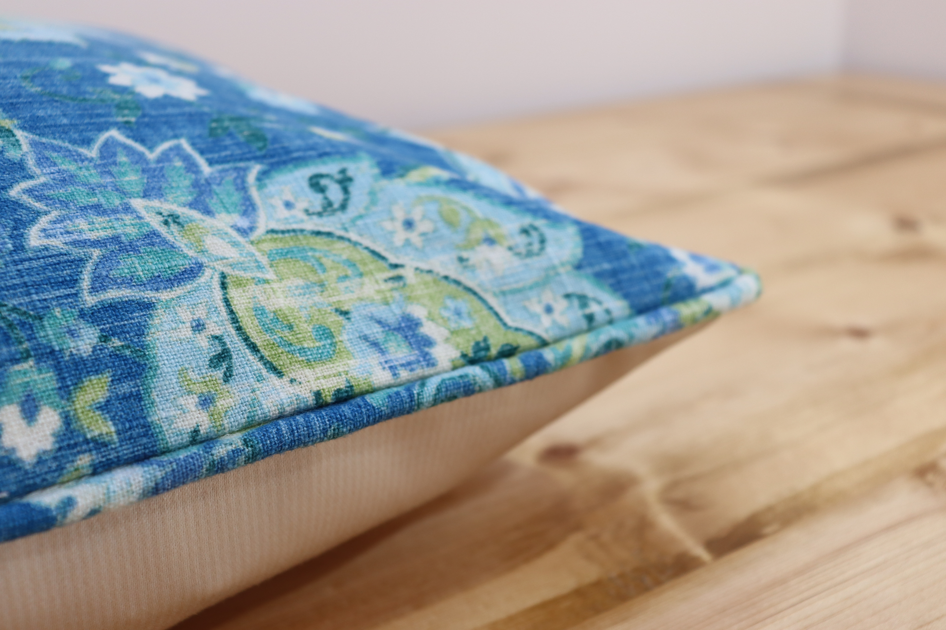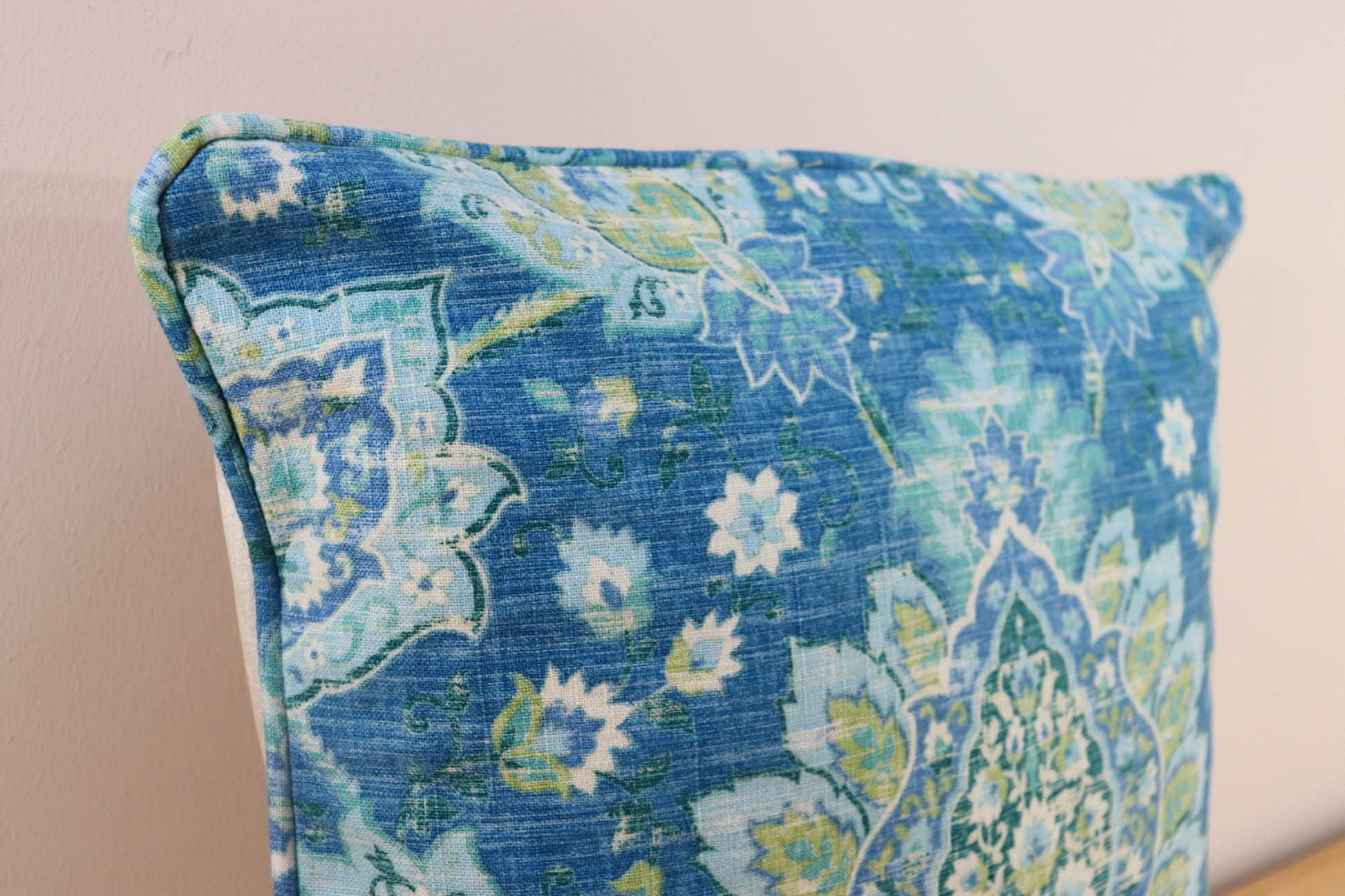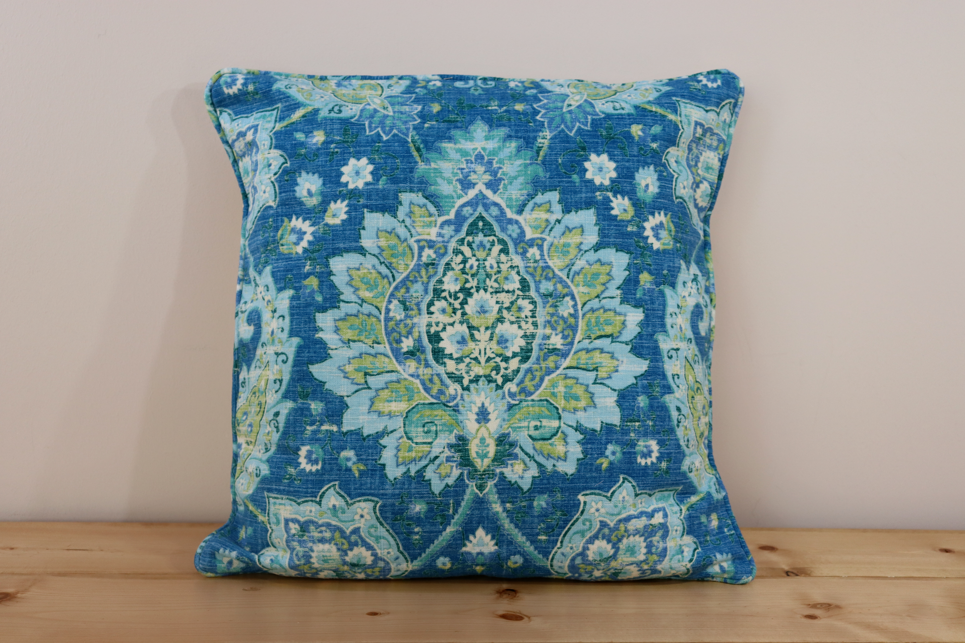 This is a upholstery weight fabric with an eclectic design in different tones of blues and greens. The other side is in a sateen type of fabric in ivory.