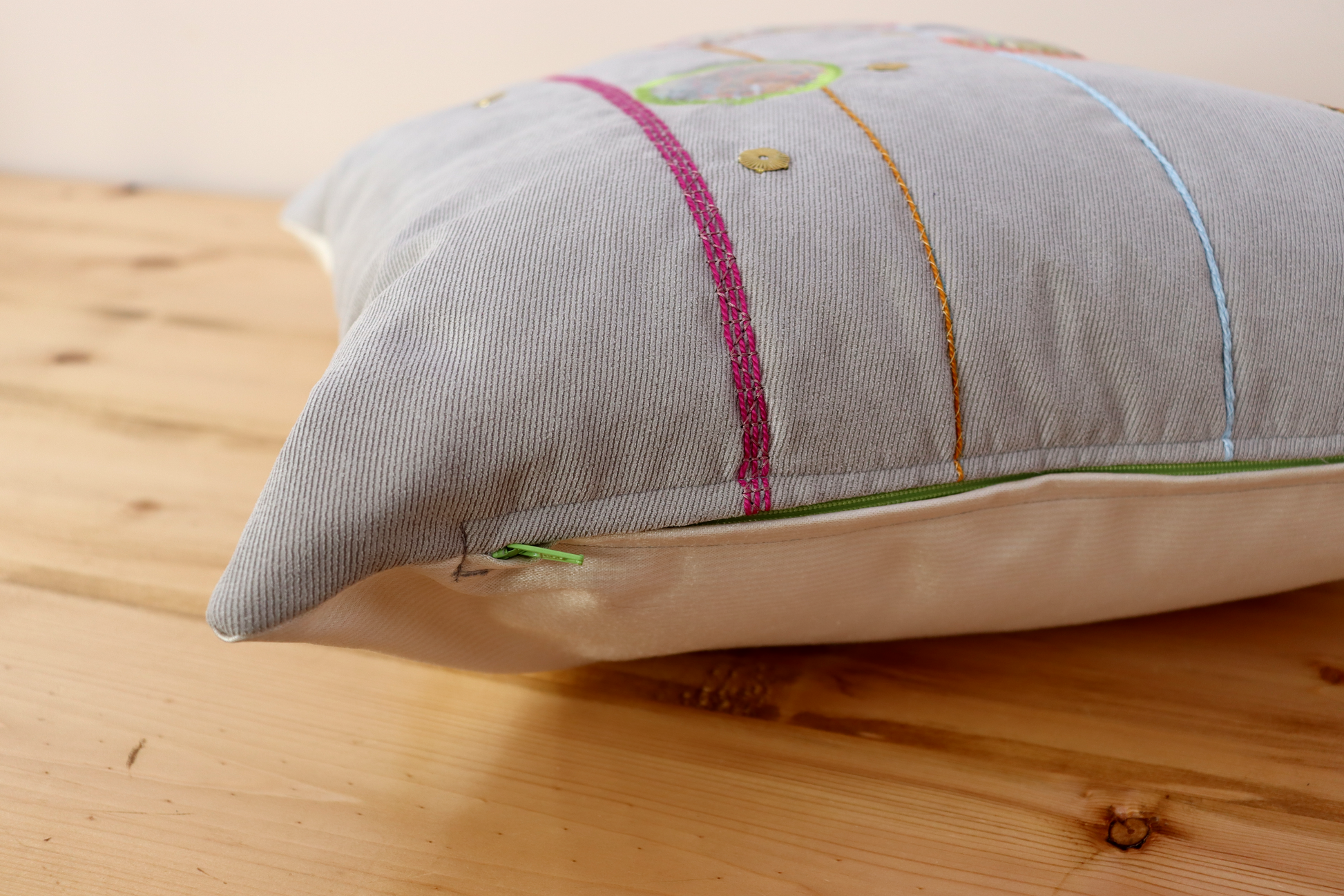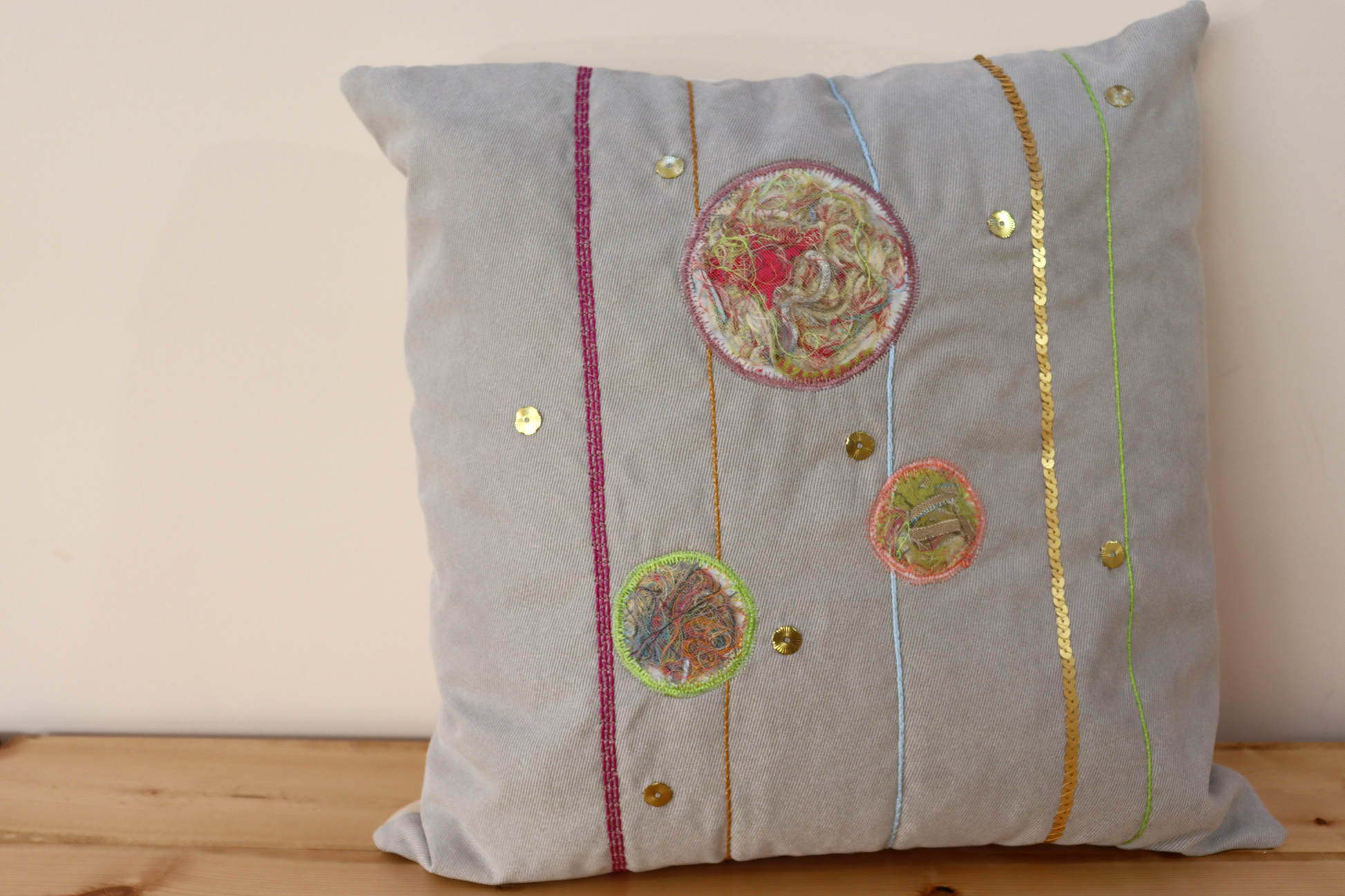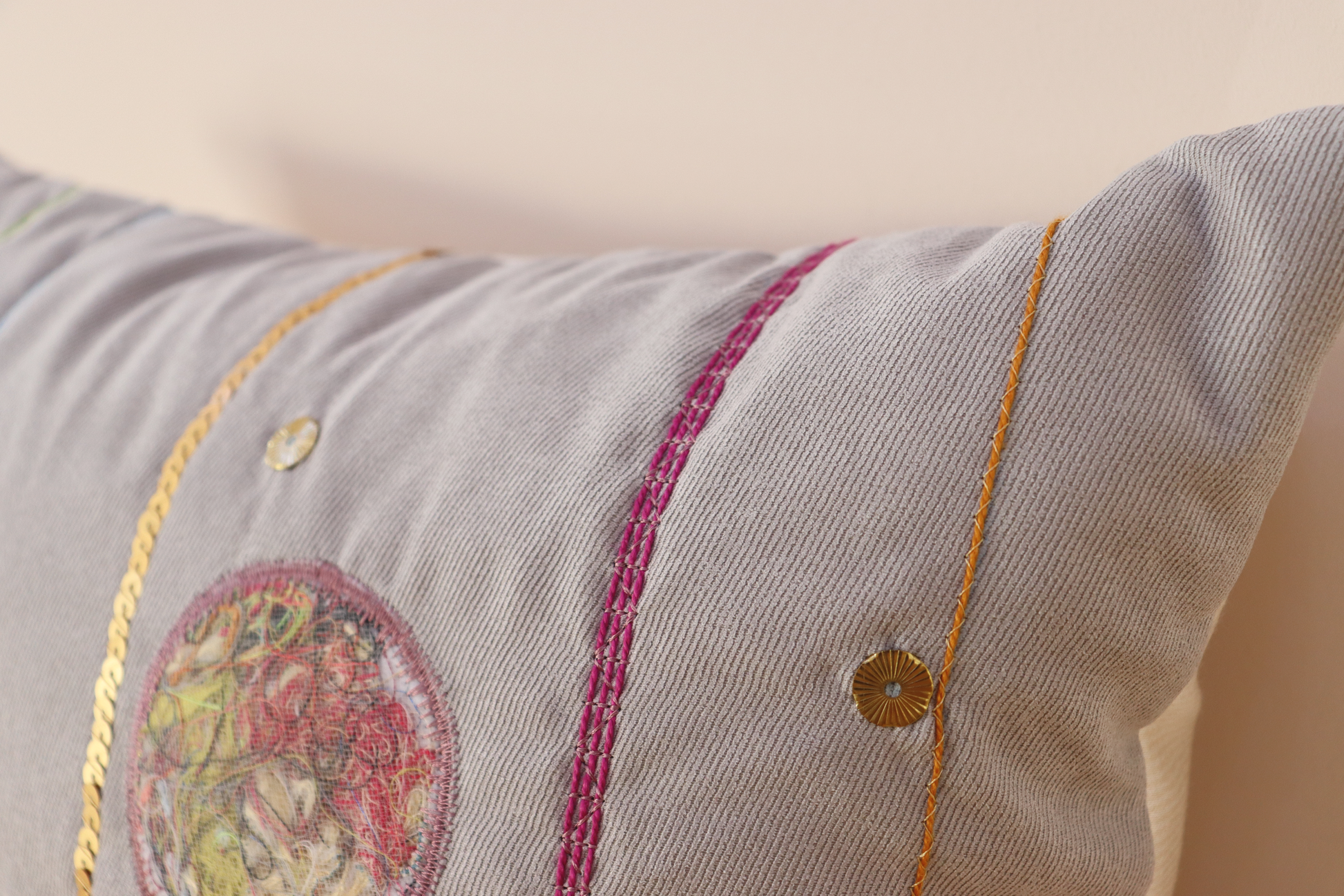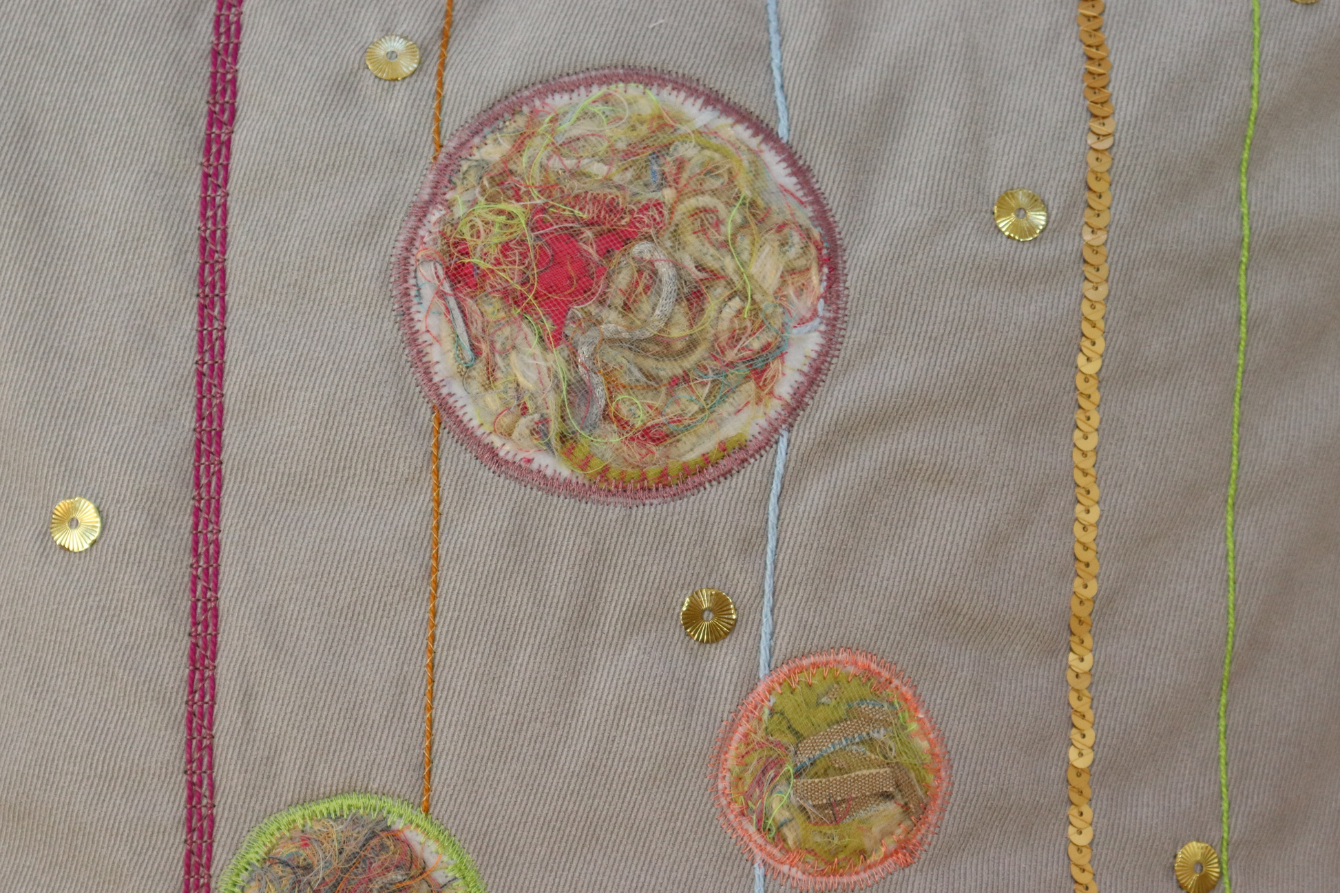 This is a light gray faux suede fabric decorated with raised applique filling with cut threads and thin fabric strips from previous projects (saving them from the trash). Other elements include yarn couching in different colors, sequins and golden decorative studs.