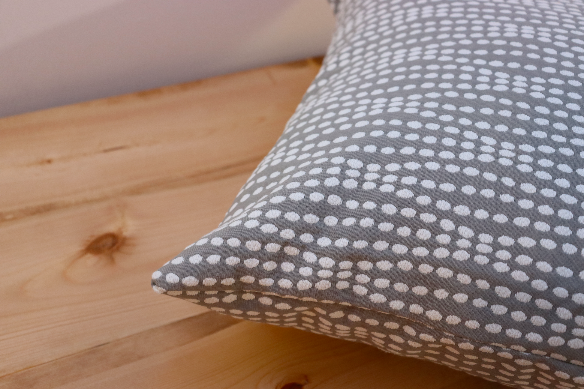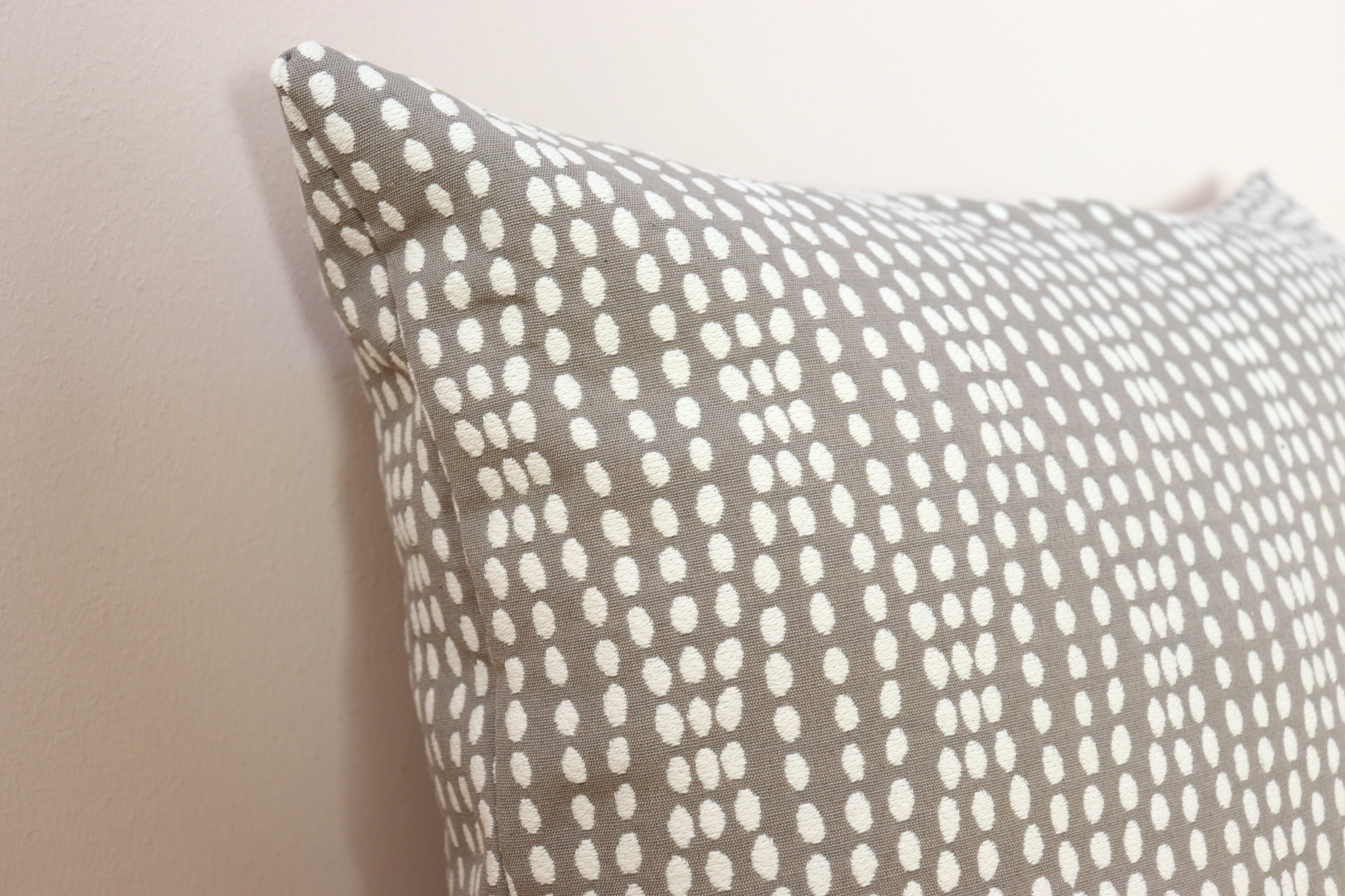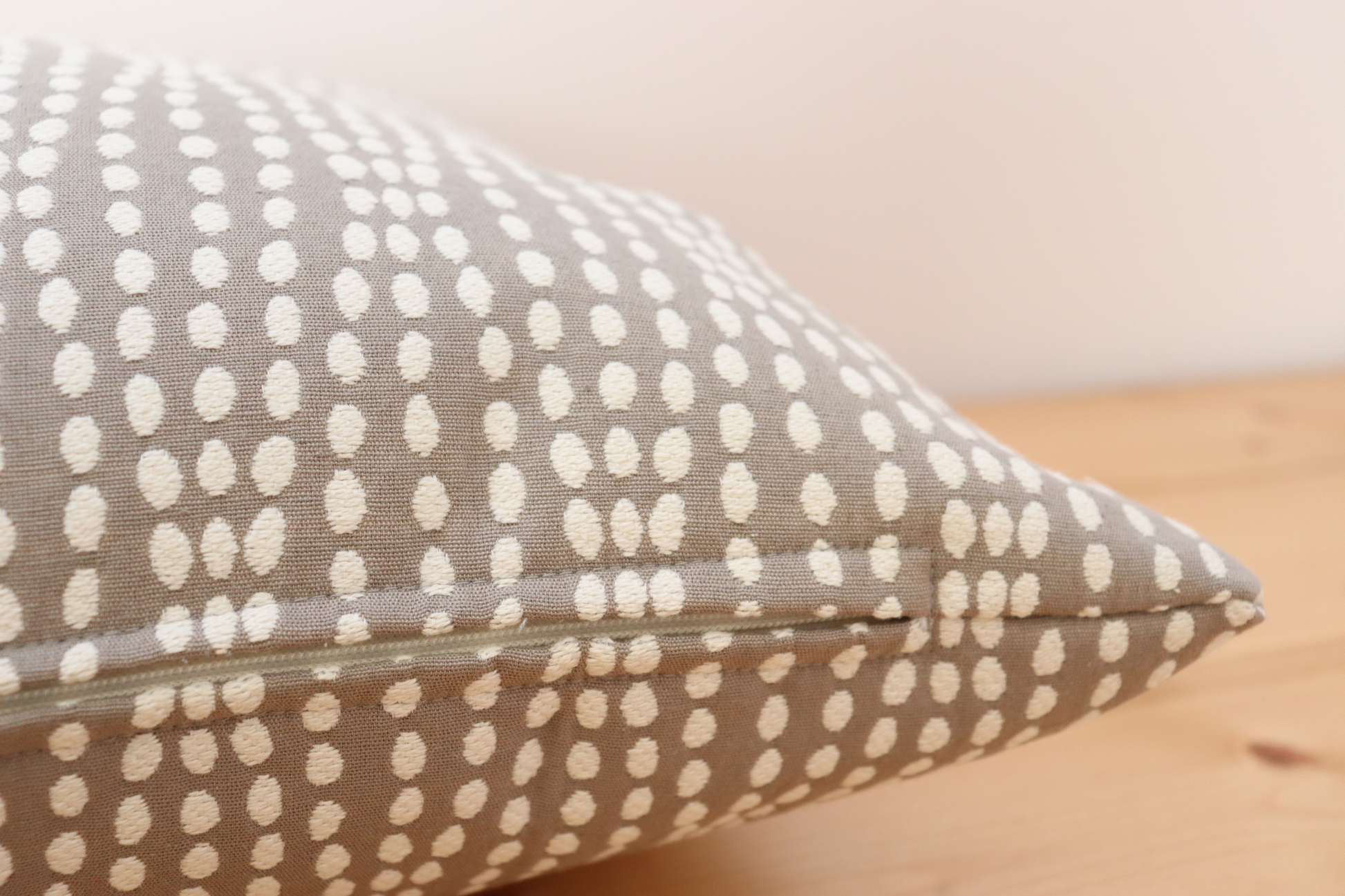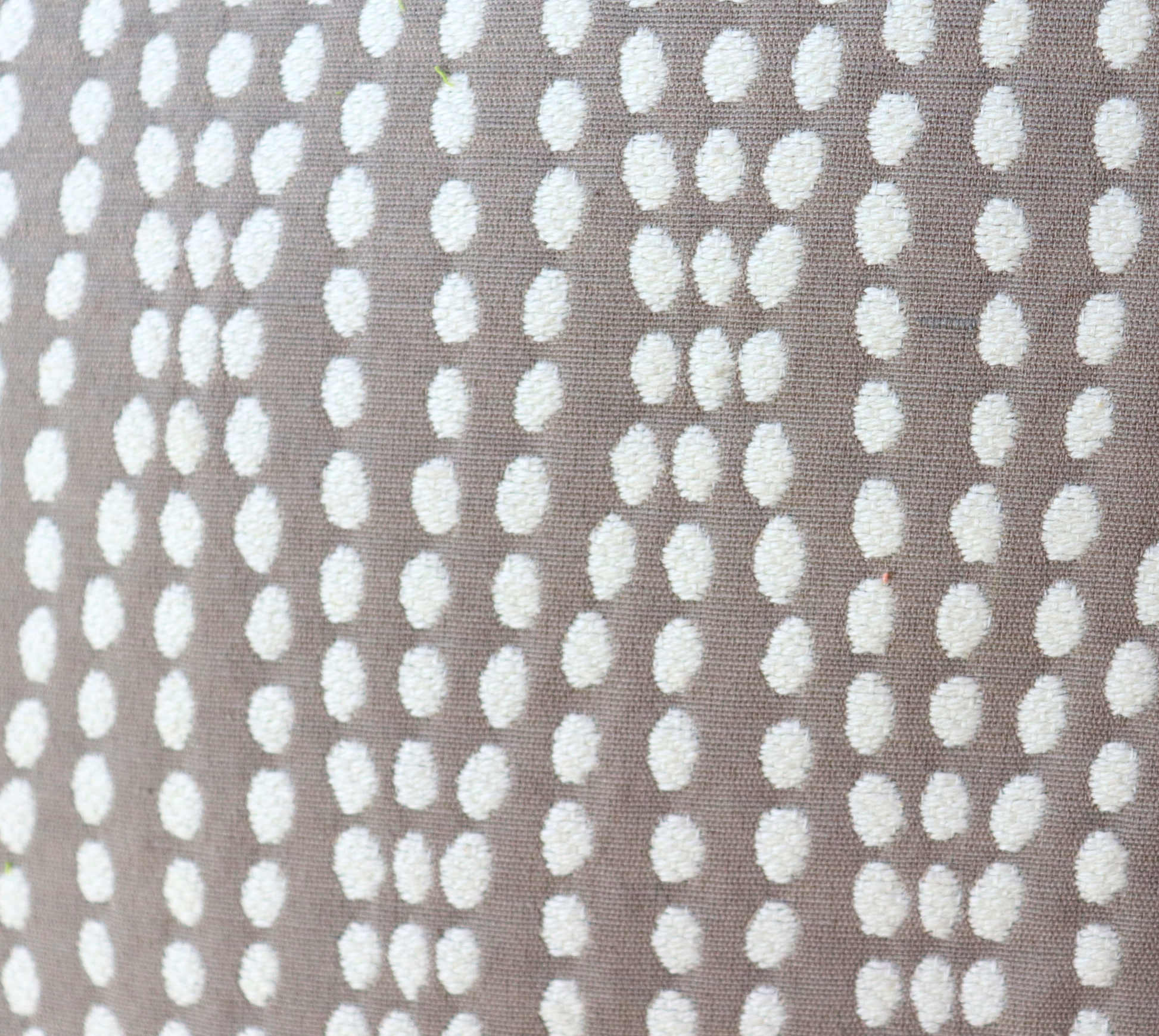 This is an upholstery weight fabric with textured ivory colored dots over a gray background.