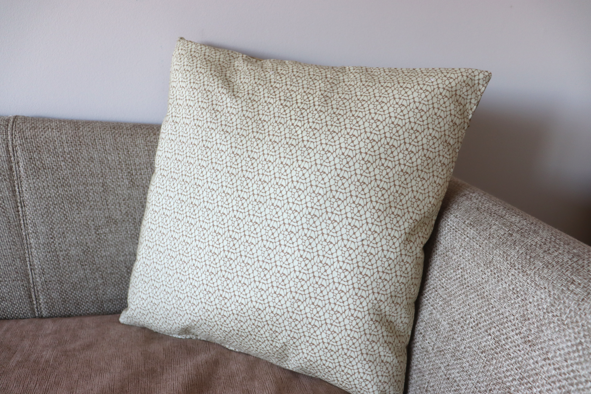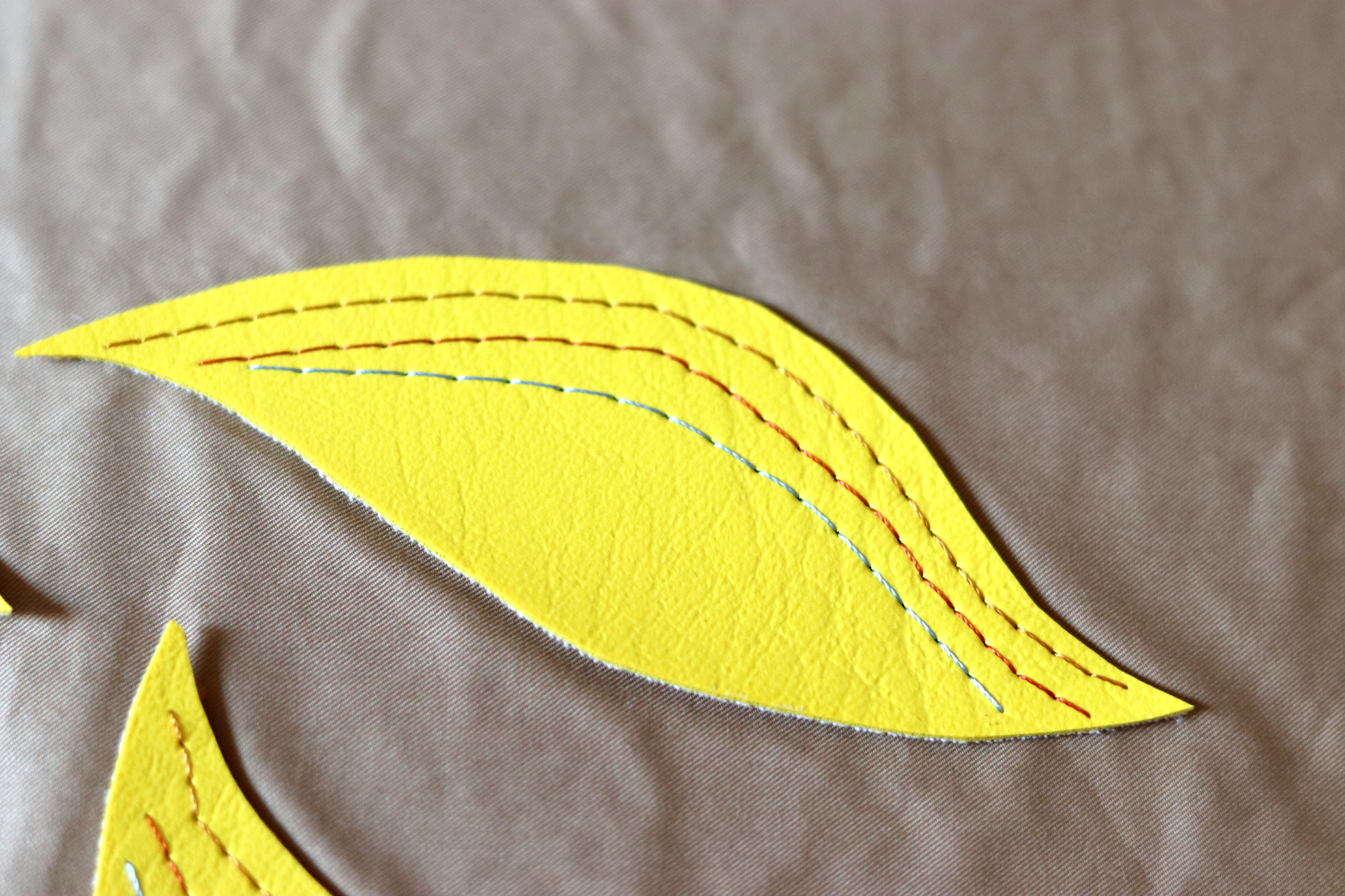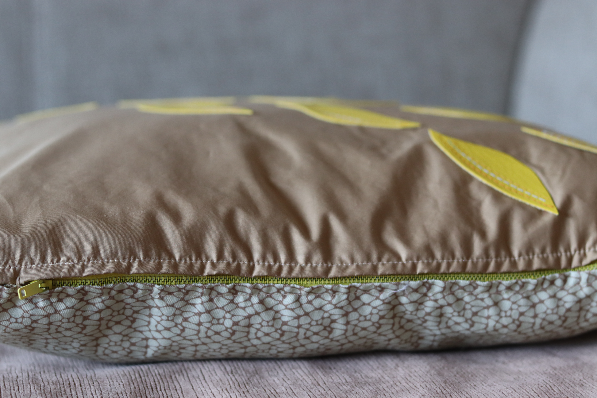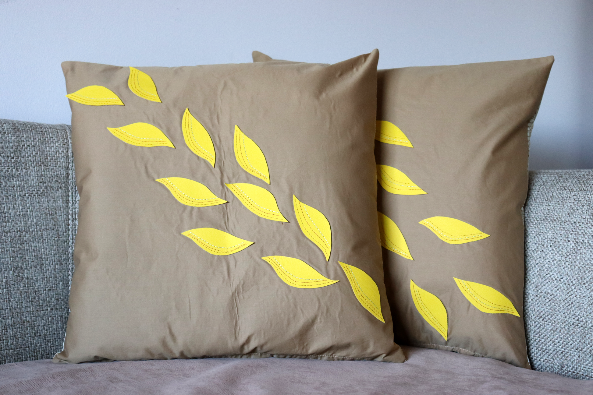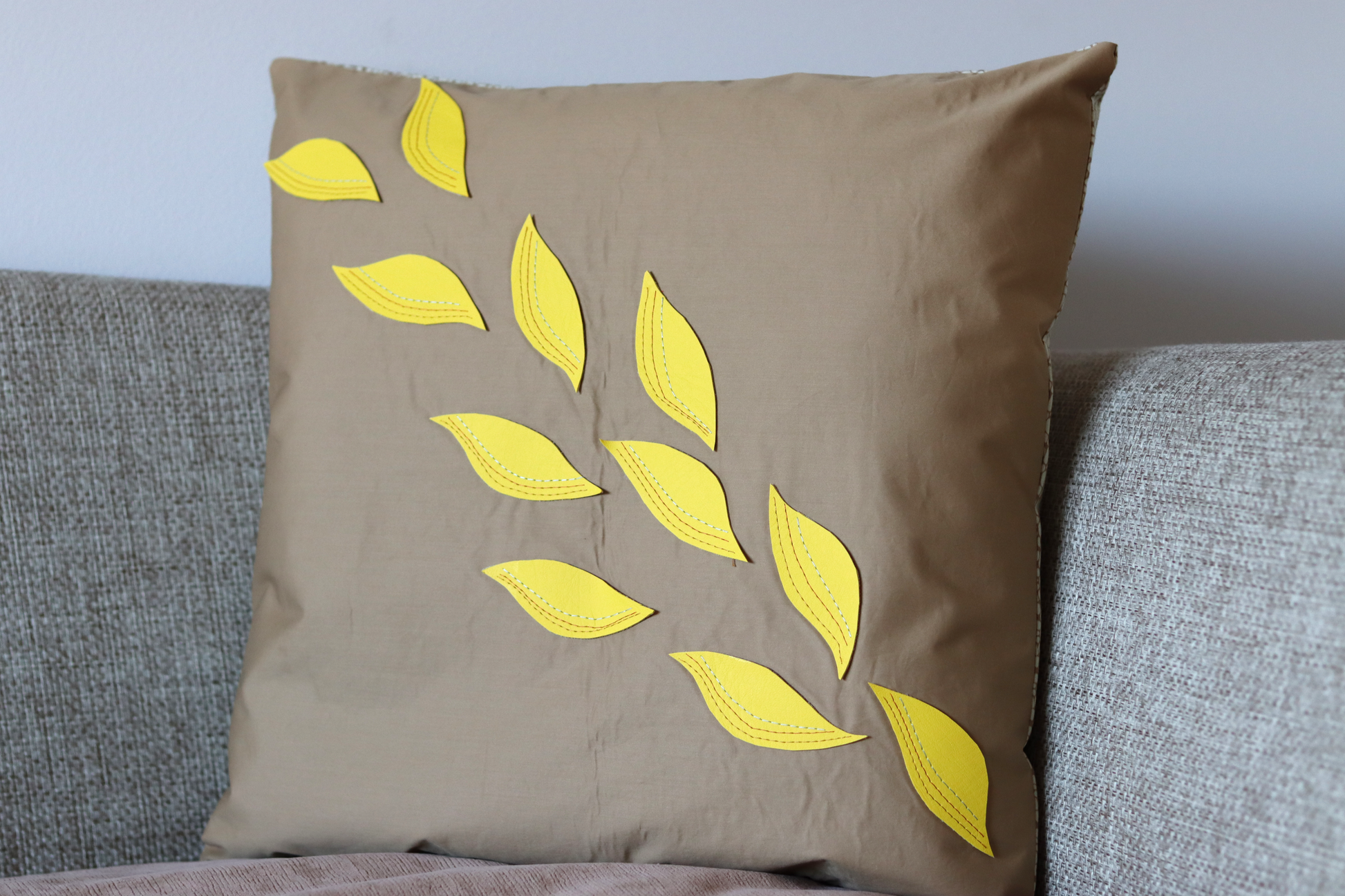 Throw pillow fabric in camel color soft fabric decorated with yellow vinyl leaves. The other side is a cotton print fabric.