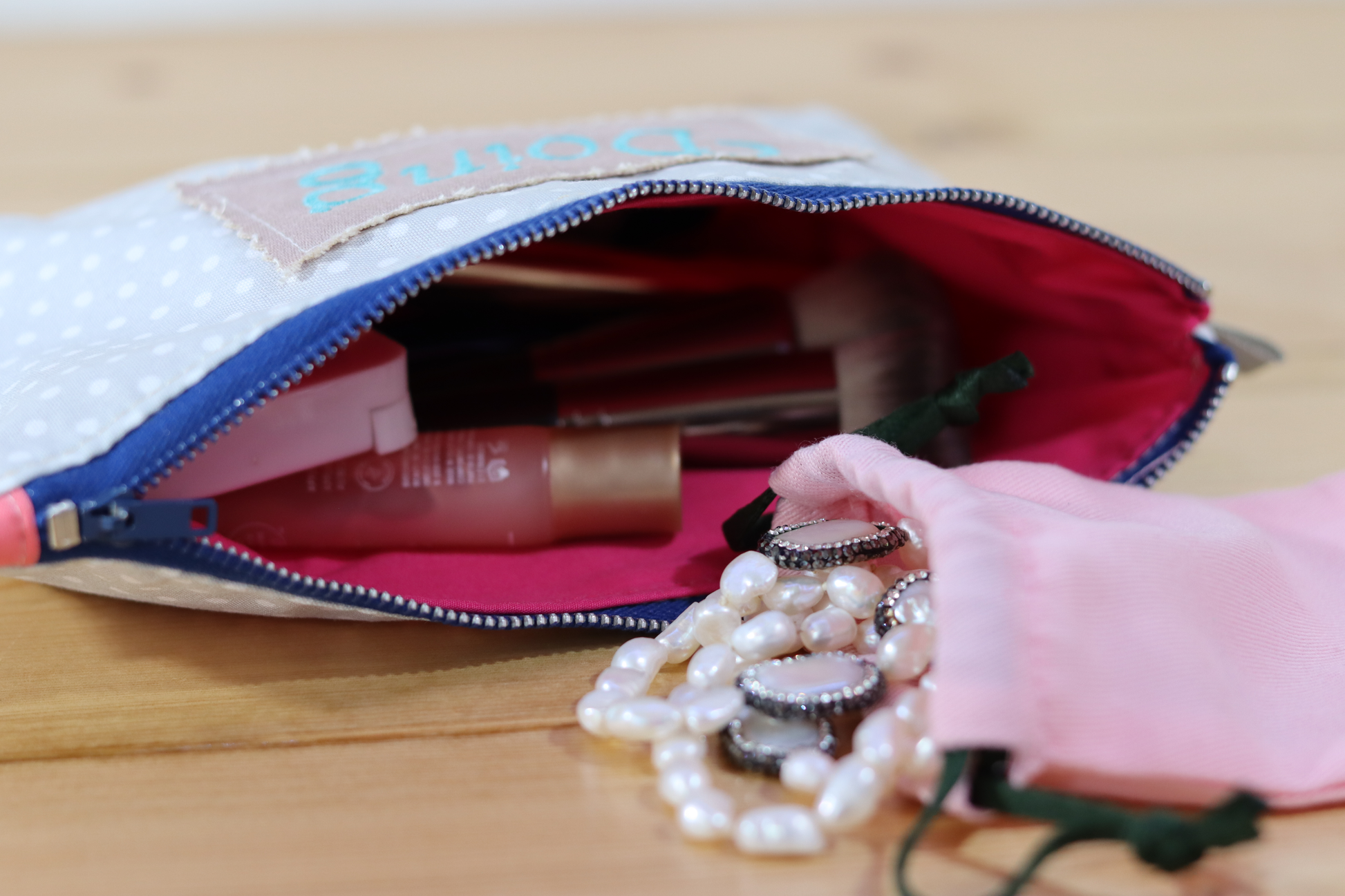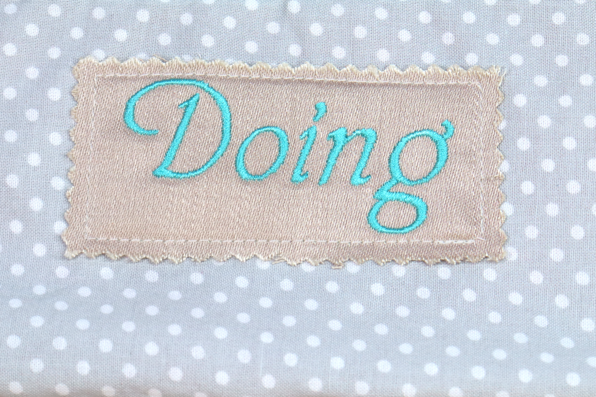 Machine embroidery word detail in blush pink fabric patch, font turquoise.