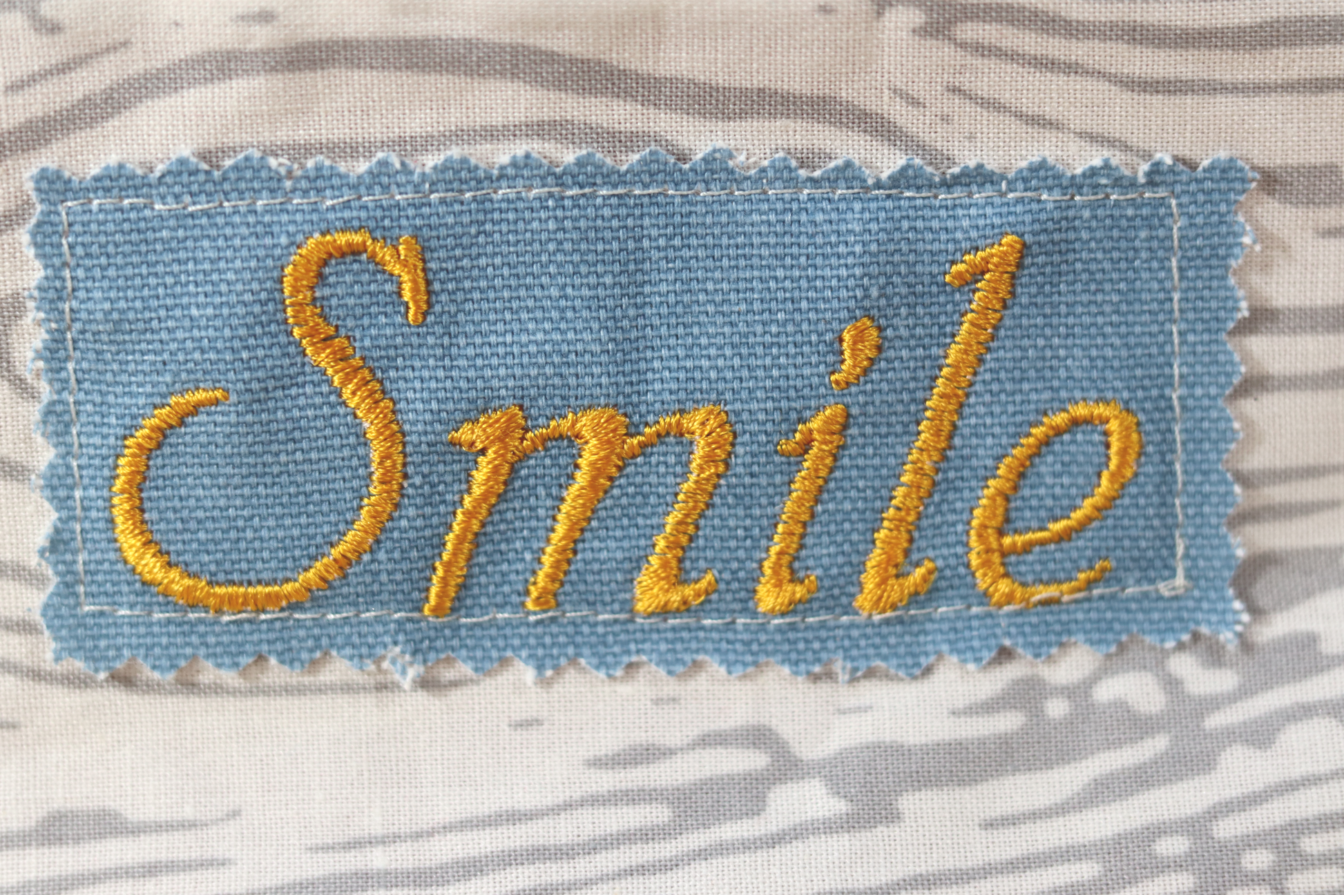 Machine embroidery word detail in blue fabric patch, font marigold.