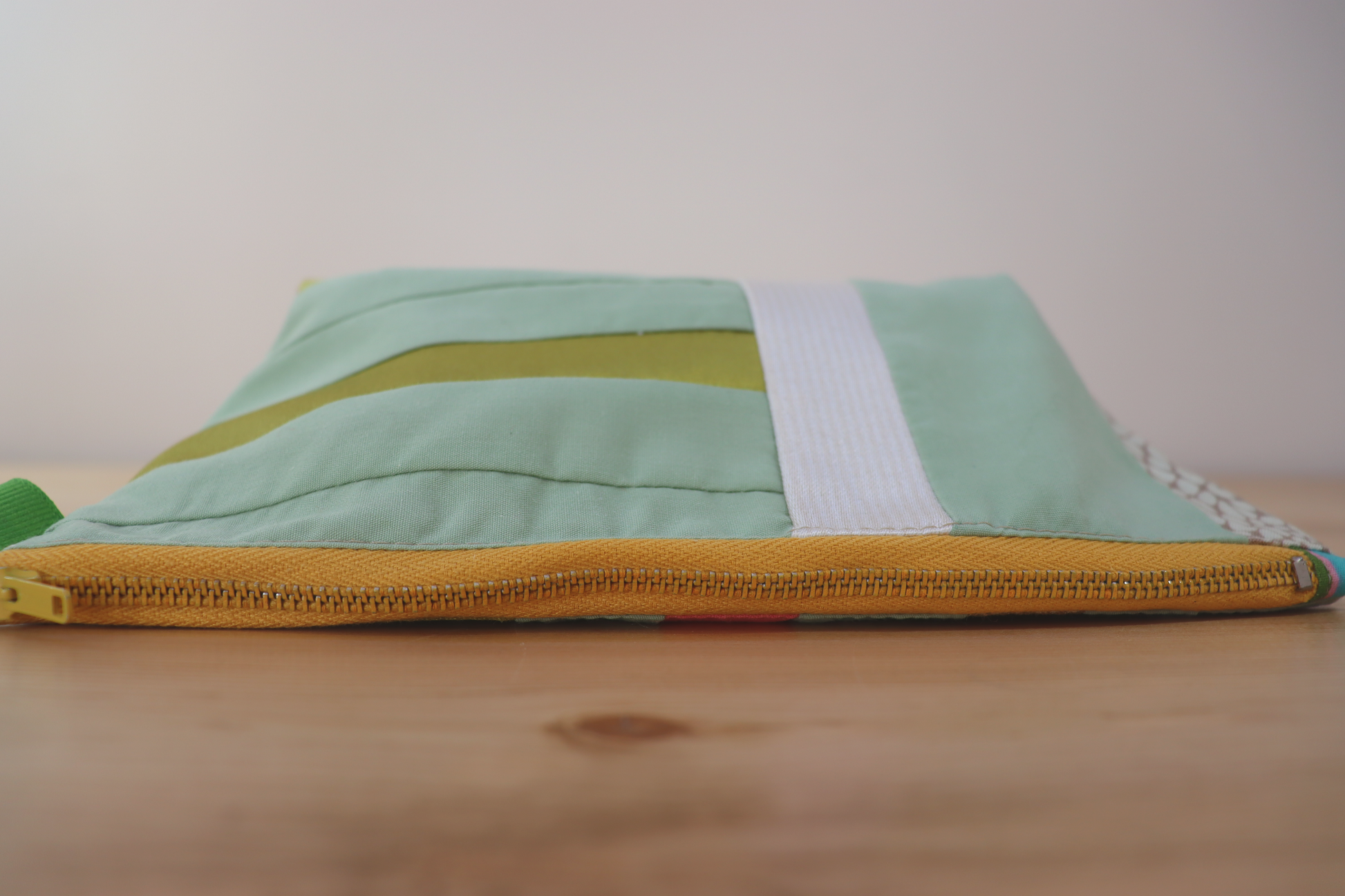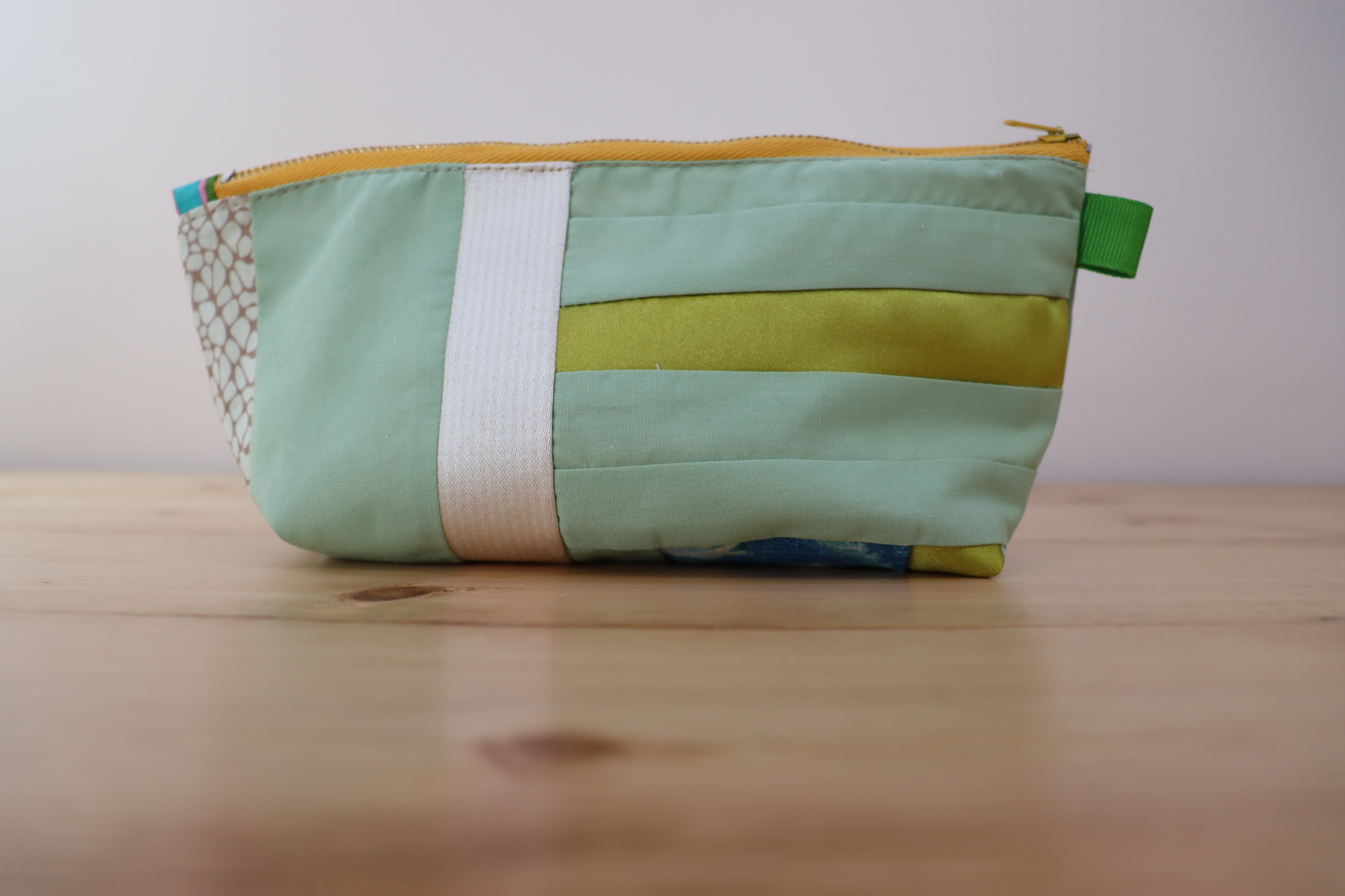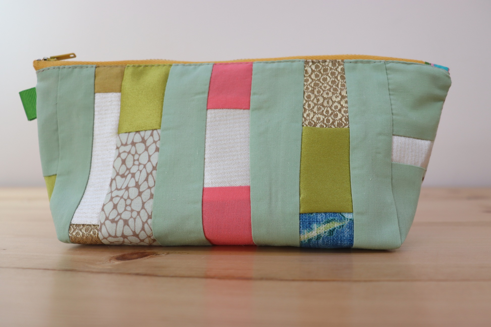 Zipper pouch bag made with different types of fabric scraps.  Helps you keep your items organized. Use it as a makeup bag, to keep jewelry, chargers, pens and hair ties. Use it to keep items when you travel.