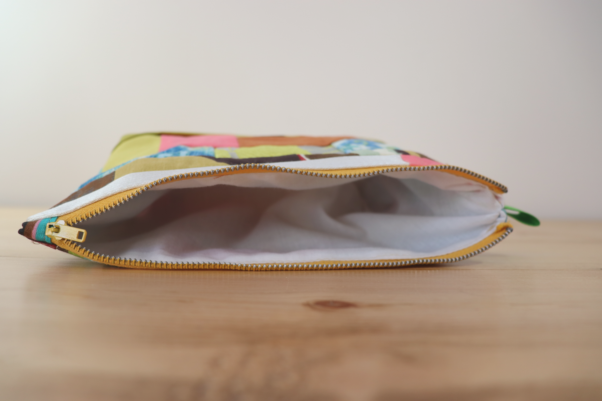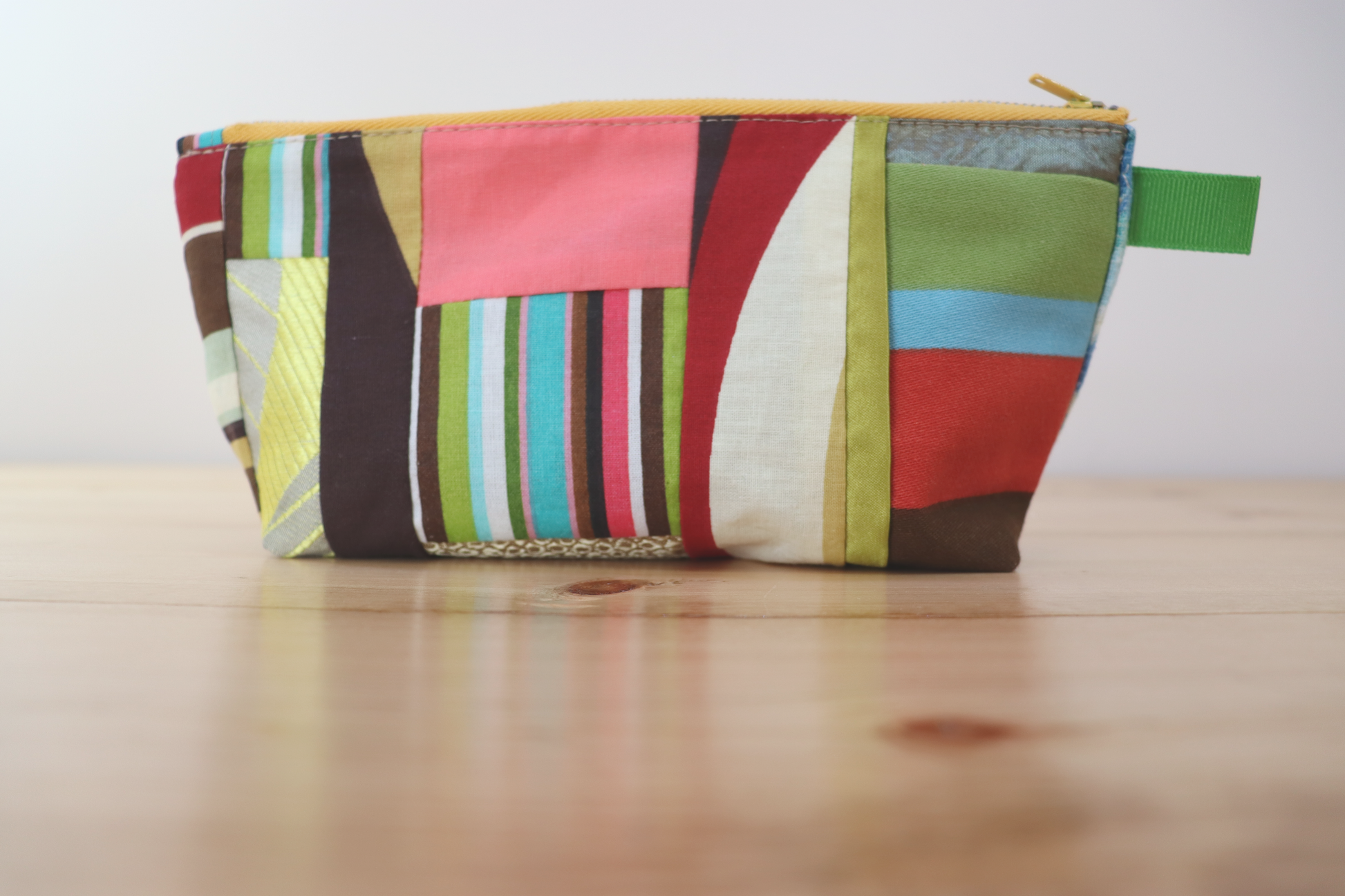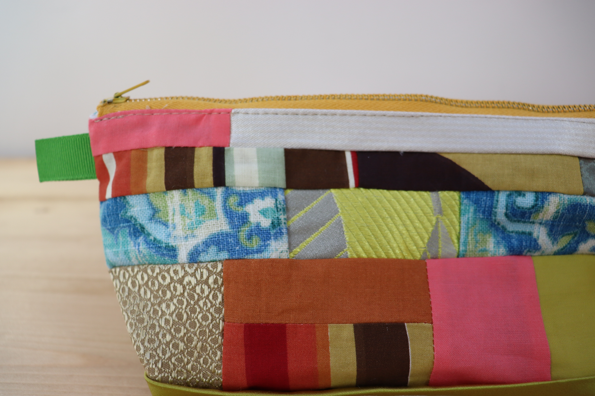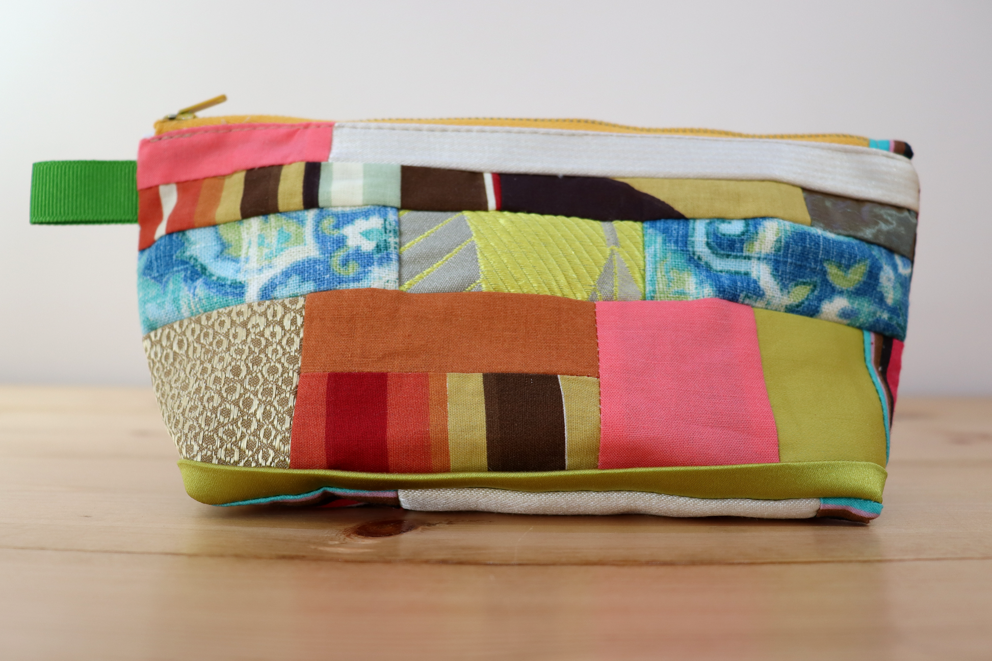Zipper pouch bag made with different types of fabric scraps.  Helps you keep your items organized. Use it as a makeup bag, to keep jewelry, chargers, pens and hair ties. Use it to keep items when you travel.